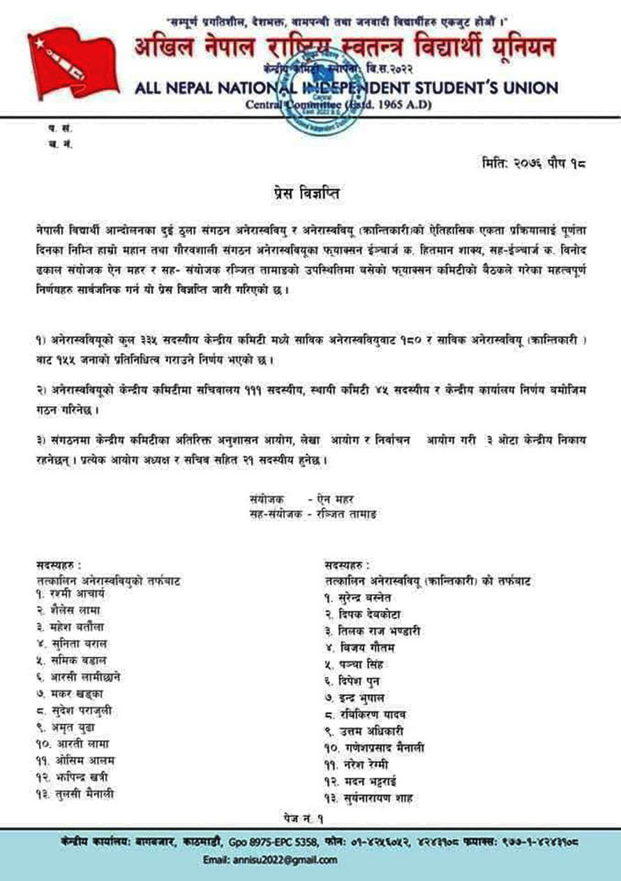 नेपाल कम्युनिस्ट पार्टी (नेकपा) निकट विद्यार्थी संगठन अखिल नेपाल राष्ट्रिय स्वतन्त्र विद्यार्थी यूनियन (अनेरास्ववियू) ले केन्द्रीय कमिटीको भागबन्डा टुंगो लगाएको छ । लामो अन्यौलता अन्त्य गर्दै अनेरास्ववियू) ले तीन सय ३५ सदस्यीय केन्द्रीय समिति बनाउने निर्णय गरेको हो ।