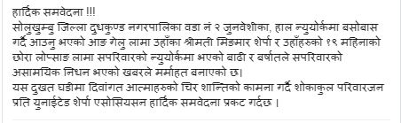 अमेरिकाको न्युयोर्कमा बस्दै आएका उनिहरुको अमेरिका स्थित आइडा नामक सामुद्रिक आँधीको प्रभावले भएको भीषण वर्षापछि आएको बाढीमा परि मृत्यु भएको हो ।