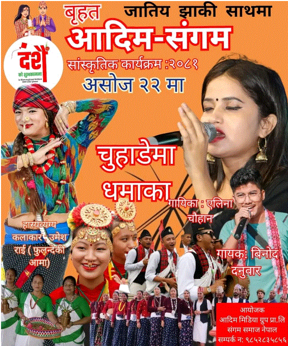 राष्ट्रिय तथा अन्तराष्ट्रिय कलकारहरुको साथमा मंगलबार उक्त कार्यक्रम गर्न लागिएको आयोजकले जनाएको छ । चाँडबाँडलाई लक्षित गर्दै मनोरञ्जनको माहोल बढाउन कार्यक्रमको आयोजना गर्न लागिएको हो । कार्यक्रममा ख्यातिप्राप्त कलकारहरु एलिना चौहान र उमेश राई (फुलन्देको आमा) आउने भएको छ । साथै उदयपुरका गायक विनोद दनुवारको पनि प्रस्तुती रहेको आयोजक संस्थाले जनाए । कार्यक्रममा बिभिन्न खाले जातजातिका नाच गान तथा झाँकी प्रदर्शन हुने भएको छ । यसले कार्यक्रमलाई थप सफल र राम्रो बनाउने आयोजक संस्थाको विश्वास छ । असोज २२ गते कार्यक्रममा सहभागी हुन आयोजक पक्षले आह्वान समेत गरेको छ ।
