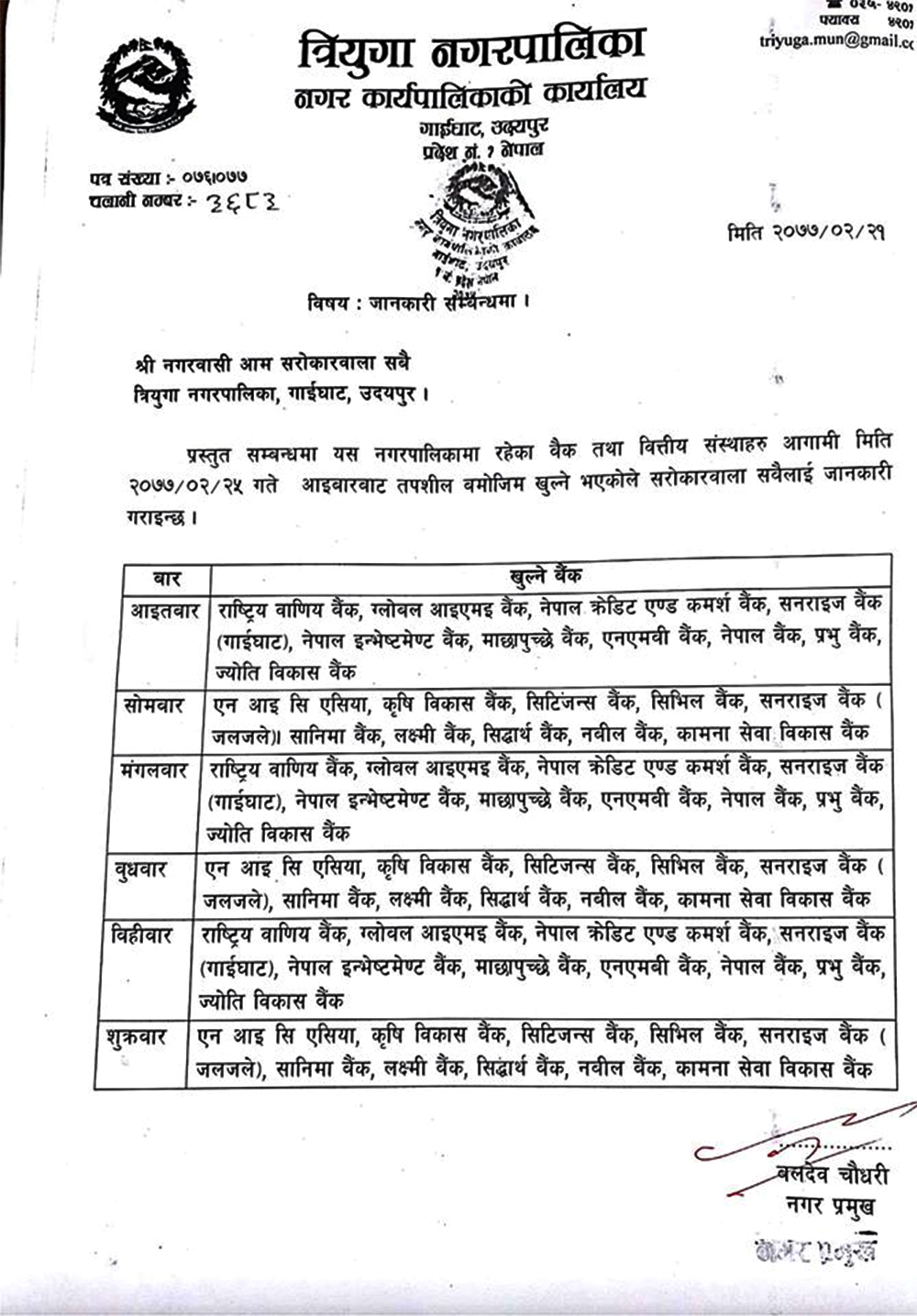 शनिबार बाहेका सवै बार कम्तिमा १० वटा बैँक खुल्ने गरी सुचना सार्वजनिक गरिएको छ । जनताका सेवाको हितलाई ध्यानमा राखी त्रियुगा नगर क्षेत्रमा रहेका बैँक तथा वित्तिय क्षेत्रहरुसँगको समन्वयमा नगरपालिकाले समय तालिका तोकेर आज सार्वजनिक गरेको छ ।