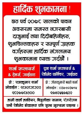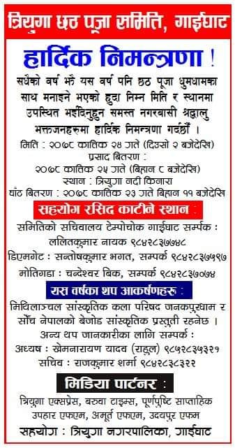 आज देशको बिभिन्न तराई क्षेत्रहरुमो बिषेश छैठ मनाइँदै छ । नेपालमा दशैँ, तिहार पछिको ठृलो पर्वको रुपमा मानिने छैठ महत्वका साथ बिषेशगरी मधेशी समुदायहरुमा मनाइने गरिन्छ । अन्तत ः छैठ पछि नेपालका ठुलो चाँडहरु एक बर्षका लागि ठप्पै हुन्छ । बिषेशगरी मधेसी समुदायहरुमा मनाईने यो बर्ष आज भोली सबै जातजाति र भुगोलको मानिसहरुले मनाउने गर्छ । पहिले मधेसी समुदायले मात्र मनाउने चाँडको रुपमा मानिसहरुले बुझ्दा अन्य समुदायहरुले यसलाई खासै चोसो नगरेको त्रियुगा छैठ समिति उदयपुरका सचिव रामकुर शर्माले बताए ।