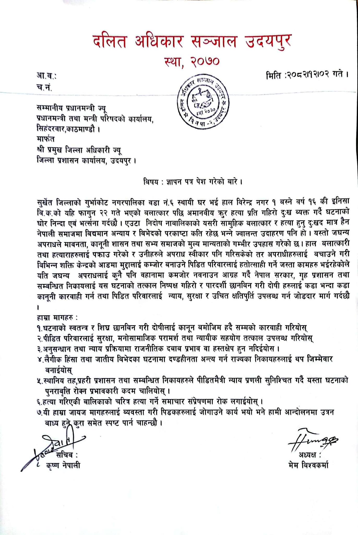 दलित अधिकार संञ्जाल उदयपुरले सुर्खेतकी इनिशा बिकको हत्यामा संलग्नलाई कडा कार्वाही नगरे सडकमा आन्दोलन निकाल्ने चेतावनी दिएको छ । सोमवार जिल्ला प्रशासन कार्यालय उदयपुरको प्रमुख जिल्ला अधिकारी धर्मराज जोशीलाई ज्ञापन पत्र बुझाउँदै हत्यामा संलग्न दोषीमाथी निष्पक्ष छानविन गरी कडा कर्वाही र उचित क्षेतीपुर्ति पिडित परिवारलाई दिनु पर्ने माग रहेको छ । संञ्जालले बिभिन्न ७ बुदामा आफुहरुको स्पष्ट माग राखेको छ । संञ्जालका अध्यक्ष मेम बिकले जातको आधारमा दोषीलाई सुविधा दिने काम नगर्न सरकारलाई आह्वान गरेको छ । दलितको हकमा यस्ता धेरै कानुनका निर्णय र कार्वाहीको कार्यान्वयनहरु कमजोर हुने गरेको अध्यक्ष बिकले बताए । धेरै दलीत समुदायकी नारीहरुलाई बलत्कार पछि सहजै हत्या गर्ने र कार्वाहीको पक्ष कमजोर हुने भएको हुँदा थप यस्ता घटनाले प्रशय पाईरहेको कुरा सम्बन्धित निकायलाई ध्यानाकर्षण गराएका हुन् । यदि यो घटनालाई पनि बिभिन्न बाहानामा बचाउन कोशिस गरे अवबको स्थिति सहज नहुने दलित अभियान्ताहरुको चेतवनी छ । उक्त ज्ञापन पत्र सिडियो कार्यालय मार्फत प्रधानमन्त्रीलाई तत्काल पठाउन संञ्जालले आह्वान गरेको छ ।