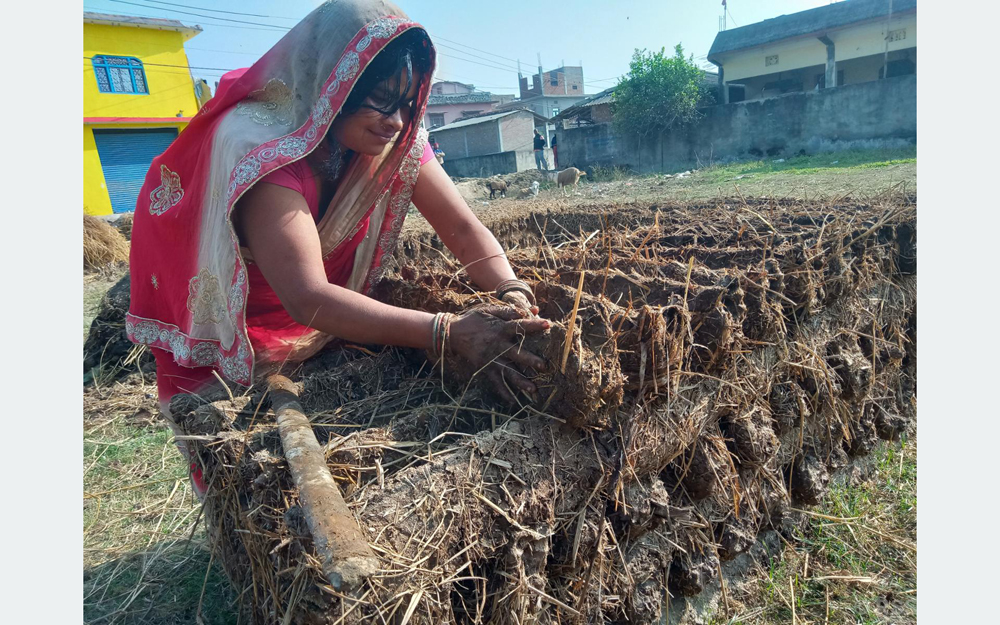 “के गर्नु पकाएर खानु परिहाल्छ”, धमाधम गोबरको चिपरी पथार्न व्यस्त देखिनुभएकी बर्दिवास नगरपालिका–९ पशुपतिनगरकी गृहिणी शैलदेवी महतो भन्नुहुन्छ, “अहिले अन्य खेती कामको व्यस्तता नभएका बेला बर्खाभरिलाई चाहिने ‘चिपरी’ पथार्दै छु ।”