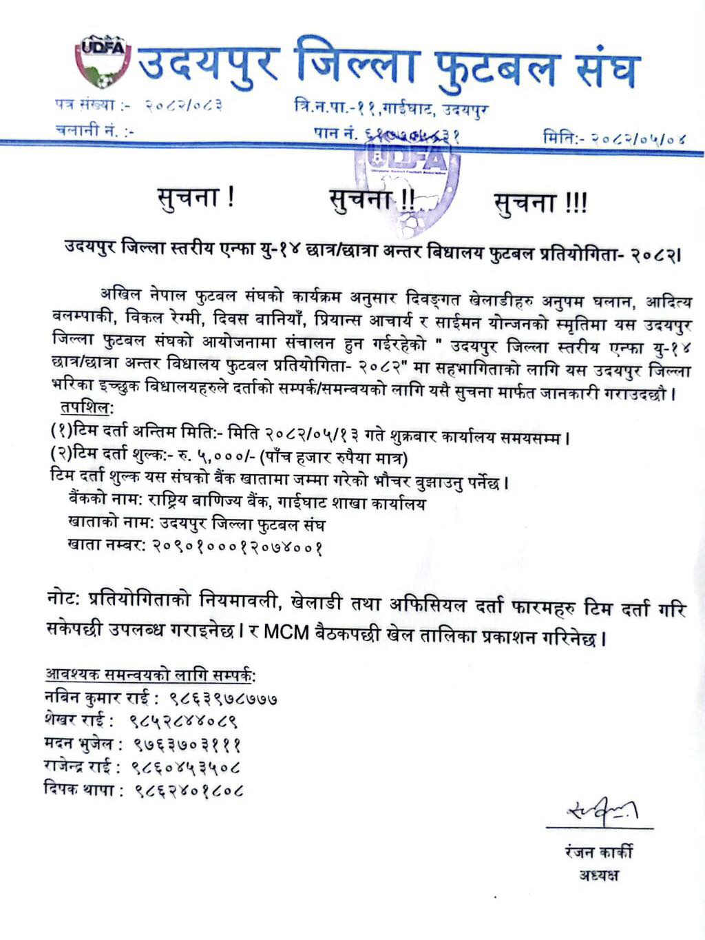 यस प्रतियोगिता दिवंगत खेलाडीहरू अनुपम घलान, आदित्य बलामपाकी, विकल्प रेग्मी, दिवस बानिया, प्रिन्स आचार्य र साइमन यौनजनको स्मृतिमा आयोजना गर्न लागिएको संघले जनाएको छ । प्रतियोगितामा सहभागी हुन चाहने जिल्लाका इच्छुक विद्यालयहरूले यहि भदौ १३ गते भित्र कार्यालय समयसम्म टिम दर्ता गरिसक्नुपर्ने छ । राष्ट्रिय वाणिज्य बैंक गाईघाट शाखामा उदयपुर जिल्ला फुटबल संघको खातामा दर्ता शुल्क रु ५ हजार जम्मा गरी भौचर बुझाउनुपर्ने सूचनामा उल्लेख छ ।