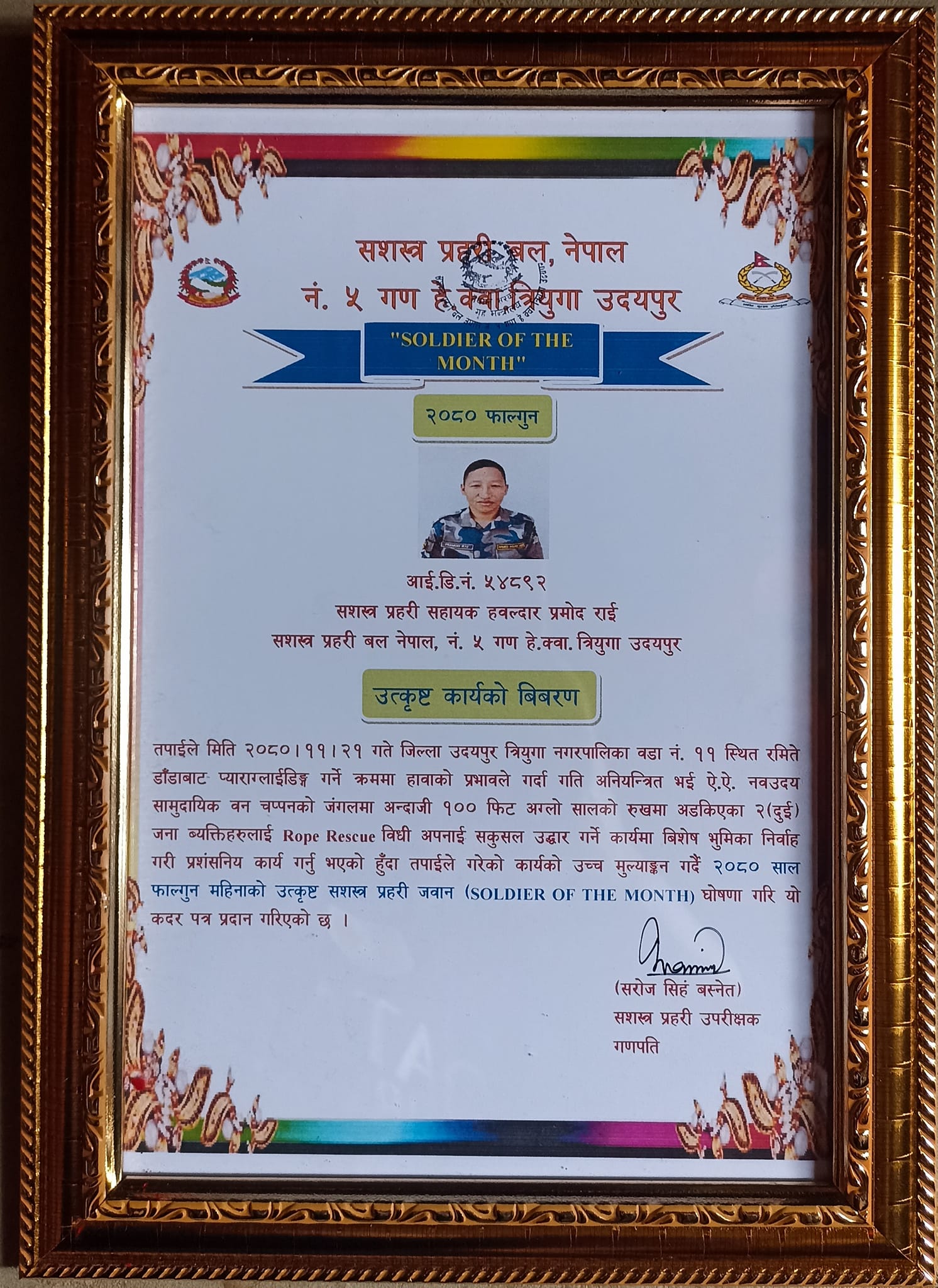 प्याराग्लाईडि स्थानीय सामुदायिक वन नव उदय सामुदायिक वन स्थित चप्पनमा सालको रुखमा अड्एिको अवस्था थियो । करिब सय फिट माथि अड्किएको दुई जनालाई राईले रप रेस्क्यु बिधिबाट उद्धार गरेका थिए । प्याराग्लाईडिङ हावाको प्रभावले रुखमा अड्किएका थिए । राईलाई मानव जिवन बचाउन जस्तो महत्वपूर्ण भुमिकामा सहभागी बनी अमुल्य जिम्मेवारी पुरा गरेको भन्दै सम्मान सहित उत्कृष्टताको कदर पत्र प्रदान गरिएको छ ।