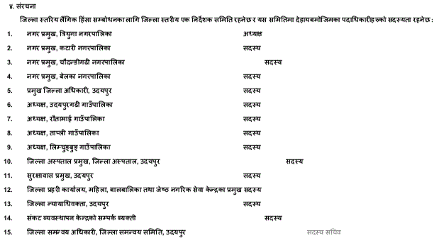 उदयपुरमा लैँङ्गिक हिंसा घटना व्यवस्थापनको काम कार्वाही थप प्रभावकारी बन्ने आशा गरिएको छ । लैँङ्गिक हिंसा सम्बोधनका लागि जिल्ला स्तरिय निर्देशक समितिले काम प्रभावकारी बनाउनेबारे कार्यविधि पास गरे सँगै यो अपेक्षा गरिएको हो । समितिको कामलाई प्रभावकारी ढँगले अघि बढाउन र कामलाई कुशलतापूर्वक सम्वोधन गर्न कार्यविधिको मुख्य आवश्यक रहेको बताईएको छ । सोमवार जिल्लाको सदरमुकाम गाईघाट स्थित लैंगिक हिंसा सम्बोधनका लागि जिल्ला स्तरिय निर्देशक समितिको पहिलो बैठकले उत्साहका साथ कार्यविधि पास गर्न सफल भयो ।