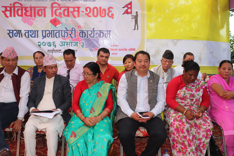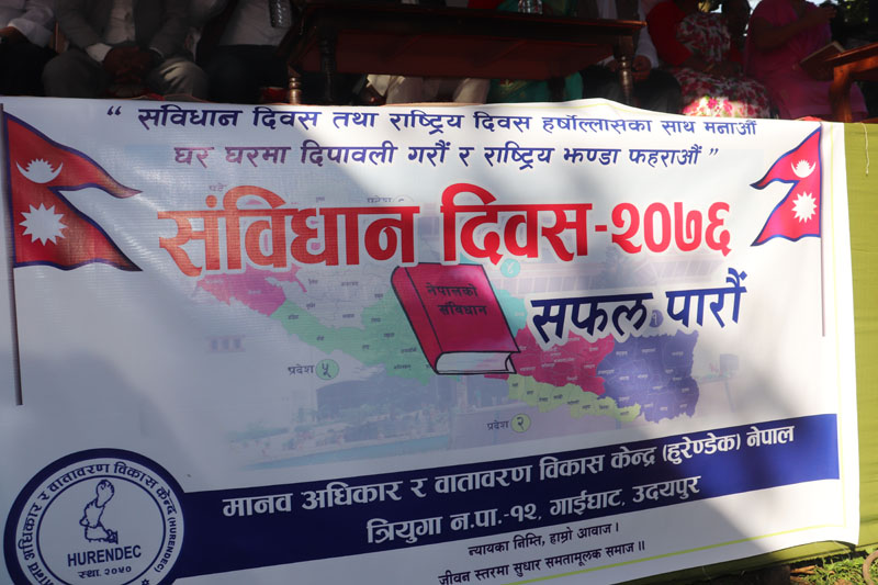 संविधान दिवस २०७६, उदयपुरमा भब्य रुपले मनाईदैछ । आज बृहद र्याली तथा कोणसभा गरि दिवस भनाईएको छ । विविध कार्यक्रमका साथ हिजोदेखि नै मनाउन सुरु गरिएको दिवस आज विशेषरुपमा र्याली तथा कोणसभाको आयोजना भएको हो । भोलीसम्म विविध कार्यक्रम गरेर दिवस मनाउने कार्यक्रम रहेको छ । आजको र्याली हालसम्मकै औपचारिक दिवस मनाउने मध्येको ठूलो र विशेष रहेको आयोजकले जनाएको छ । हजारौंको सहभागिता रहेको र्यालीमा  विद्यार्थी, कर्मचारी, शिक्षक, व्यापारी, व्यवसायी, गैरसरकारी संस्थाा, नागरिक समाज, पत्रकार, सुरक्षाकर्मी, राजनीतिक दलबाट व्यापक सहभागिता थियो ।