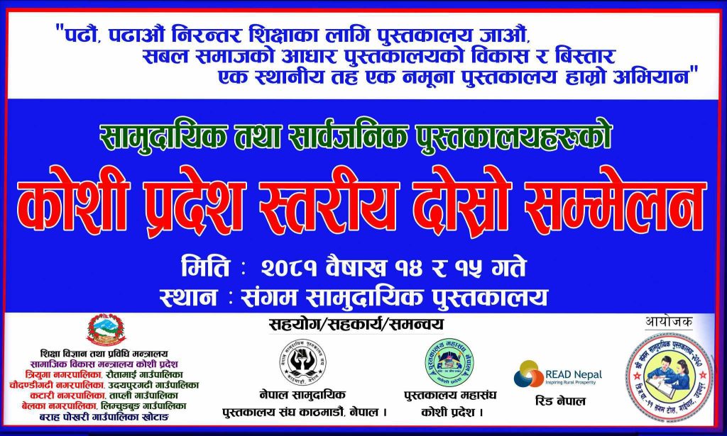 उदयपुरको सदरमुकाम गाईघाटमा सामुदायिक तथा सार्वजनिक पुस्तकालयहरुको कोशी प्रदेश स्तरिय दोस्रो सम्मेलन हुने भएको छ । “पढौँ, पढाऔँ निरन्तर शिक्षका लागी पुस्तकालाय जाऔँ, सवल समाजको आधार पुस्तकालयको विकास र बिस्तार एक स्थानिय तह एक नमुना पुस्तकालय हाम्रो अभियान” भन्ने मुल नाराका साथ संघगम पुस्तकालयले प्रदेश स्तरिय दोस्रो सम्मेलन गर्न लागेको हो ।