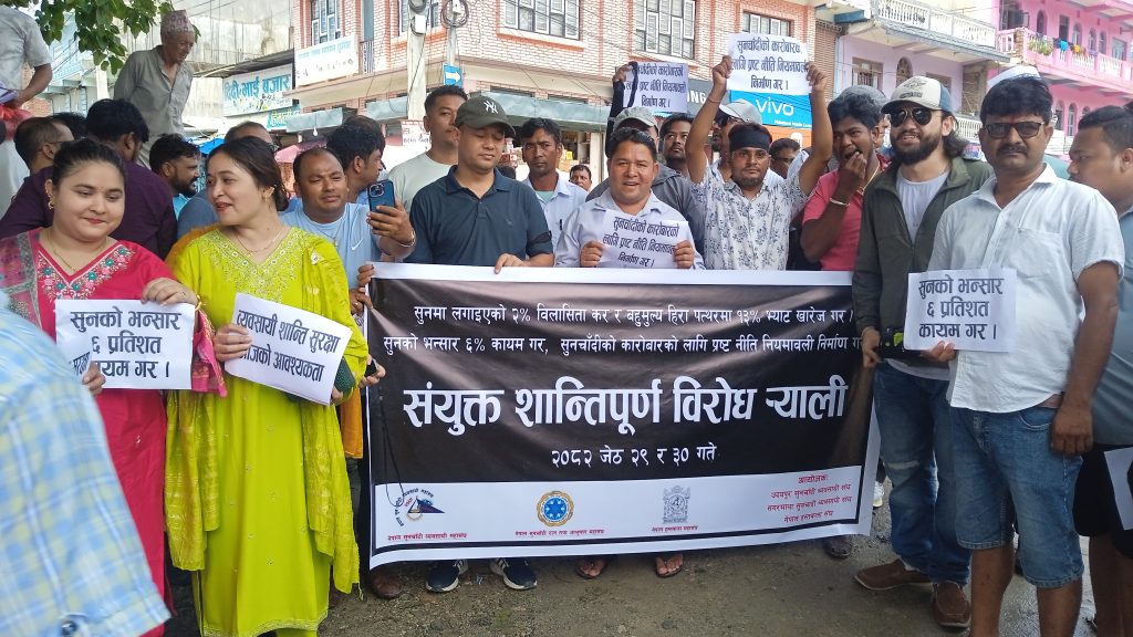 पूर्णपुष्टि, असार १२ । उदयपुरमा (भोली) शुक्रबार सुनचाँदी व्यवसायीहरुले पसल बन्द गरेर शान्तिपूर्ण आन्दोलन गर्ने निर्णय गरेको छ । सरकारले आगामी आर्थिक बर्षको बजेटमा सुनचाँदी तथा हिराका गरगहनाको ब्याबसायमा लगाएको बिलासीता करको बिरुद्धमा ब्याबसायीहरु आन्दोलनमा उत्रिन लागेका हुन् ।