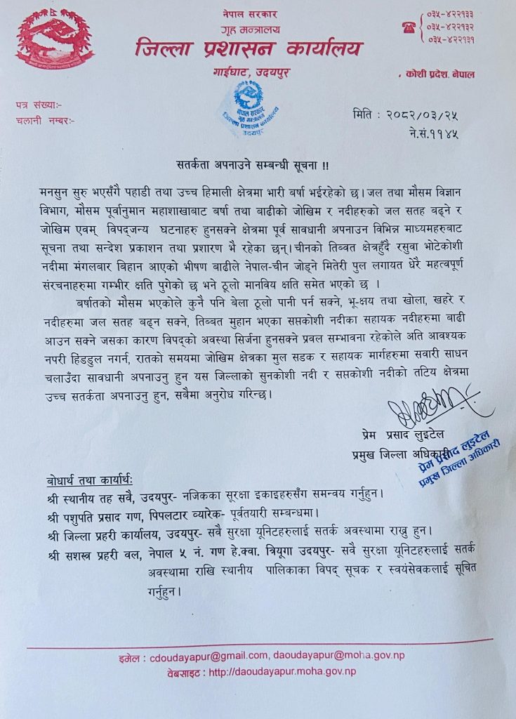 उदयपुर प्रशासनद्धारा सुनकोशी र सप्तकोशीको तटीय क्षेत्रमा उच्च सतर्कता अपनाउन आग्रह