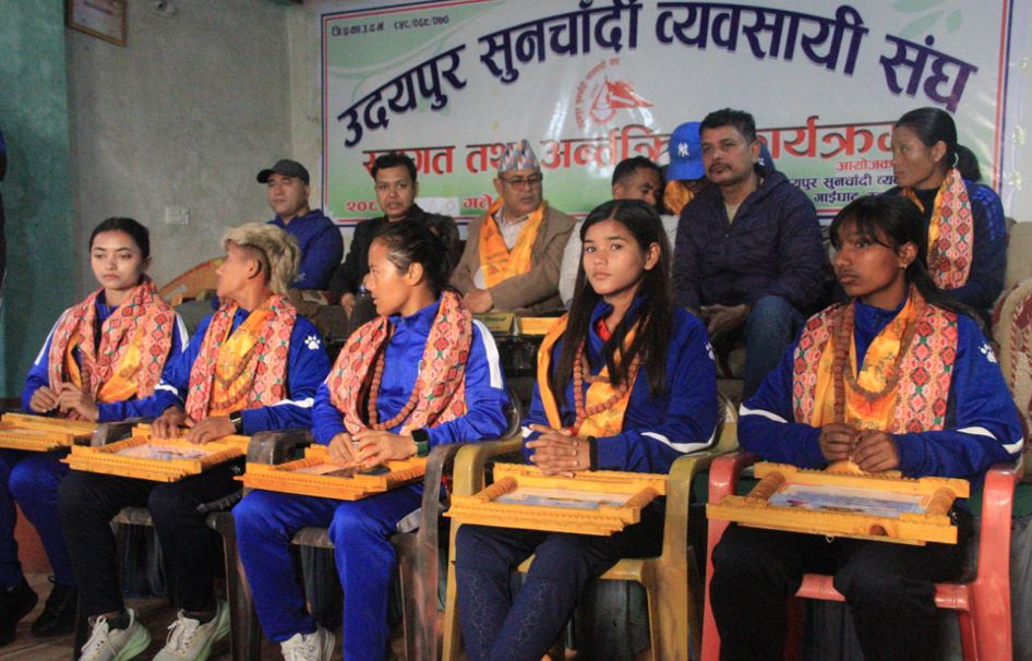 सुनिल राई, गाइघाट ÷ फागुन १० । उदयपुर सुनचादी व्यवसयी संघले फिफा रेफ्री सहित ६ जना राष्ट्रिय महिला खेलाडीलाई सम्मान गरेको छ । आइतबार बिहान संघको सभाहलमा एक कार्यक्रमको बिच जिल्लाको तिनजना सहित ६ जनालाई सम्मान गरेको हो ।