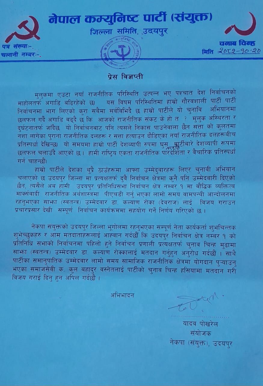 निर्वाचनमा भाग लिएको सो पार्टीले अन्य जिल्लामा उम्मेदवार उठाए पनि उदयपुरमा पार्टीको उम्मेदवार मनोनयन नगरिएकोले स्वतन्त्र उम्मेदवार रोकालाई समर्थन जनाएको आज जारी विज्ञप्तिमा जनाएकोछ । डा. रोका बौद्धिक व्यक्तित्व, लामो समय मार्क्सवादी राजनीतिक आन्दोलनमा रहेकाले उनलाई विजय गराउन प्रचारप्रसारदेखि सम्पूर्ण निर्वाचन कार्यक्रममा सहभागी गर्ने निर्णय गरेको विज्ञप्तिमा उल्लेख छ ।