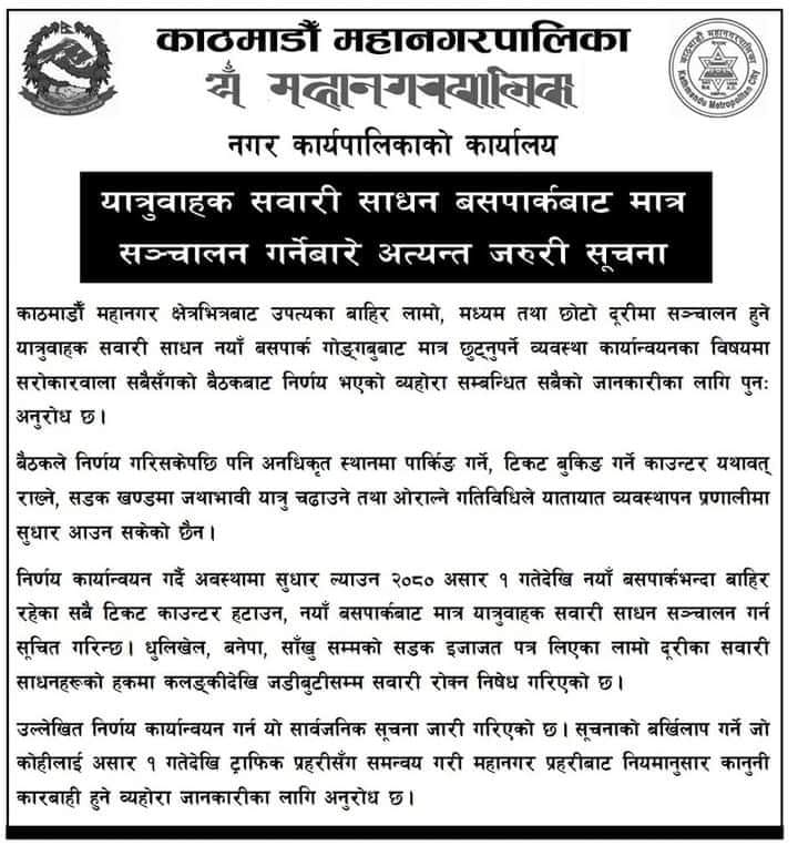 काठमाडौँ उपत्यसका क्षेत्रभित्रबाट बाहिर लामो, मध्यम तथा छोटो दुरीमा सञ्चालन हुने यात्रुवाहक सवारी साधन नयाँ बसपार्क गोङ्गबुबाट मात्रै छुट्नुपर्ने व्यवस्था कार्यान्वयन गर्ने निर्णय भएको भन्दै महानगरपालिकाले निर्देशन दिएसँगै आजदेखि लागु भएको हो । ‘निर्णय कार्यान्वयन गर्दै अवस्थामा सुधार ल्याउन २०८० असार १ गते देखी नयाँ बसपार्कभन्दा बाहिर रहेका सबै टिकट काउन्टर हटाउन, नयाँ बसपार्कबाट मात्र यात्रुवाहक सवारी साधन सञ्चालन गर्न सूचित गरिन्छ, महानगरले भनेको छ, ‘धुलिखेल, बनेपा, साँखुसम्मको सडक इजाजत पत्र लिएका लामो दुरीका सवारी साधनको हकमा कलङ्कीदेखि जडीबुटीसम्म सवारी साधन रोक्न निषेध गरिएको छ ।’