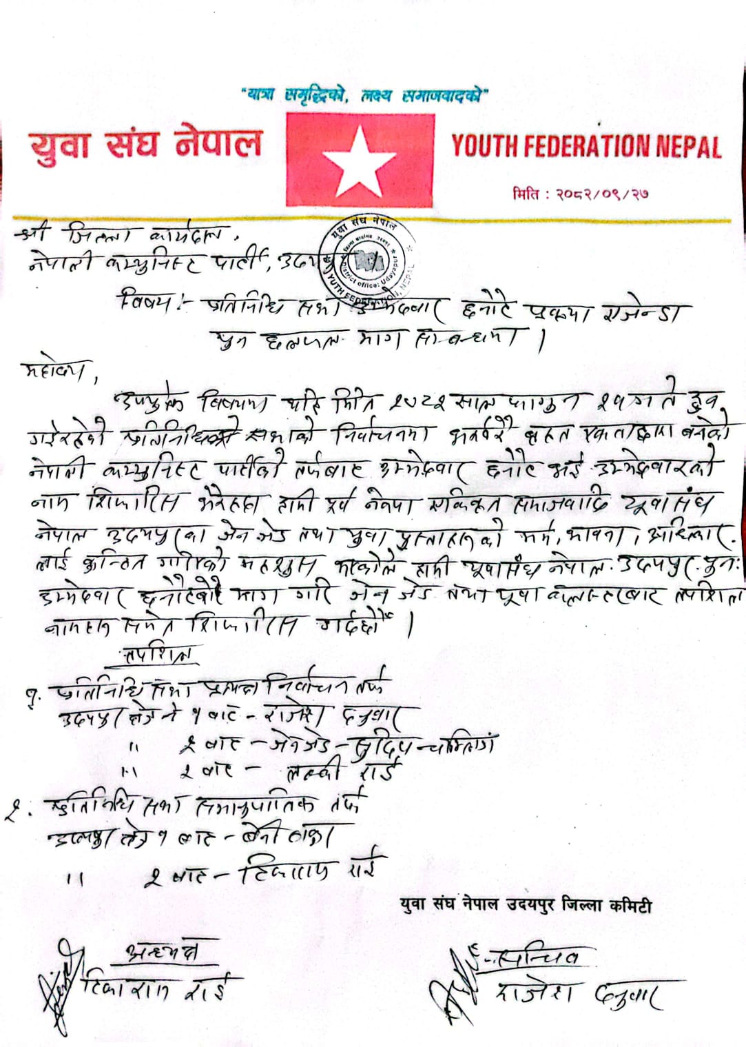 नेपाली कम्युनिष्ट पार्टी उदयपुरले भर्खरै मात्र आगामी निर्वाचनका लागि उम्मेदवार सिफारिस गरेको छ । नेकपा एकीकृत समाजवादी सहितको नेपाल कम्युनिष्ट पार्टीले उदयपुरमा पनि १८ जनाको नाम सिफारिस गरेको हो । उक्त सिफारिसमा पूर्व एकीकृत समाजवादी पार्टीका युवाहरु भने असन्तुष्ट रहेको छ । पूर्व एकीकृत समाजवादीका युवाहरु र जेन्जीहरुको माग अनुसार युवाहरुलाई उम्मेदवारी सिफारिस नगरेको भन्दै समाजवादी निकट युवा संघ नेपालले आफै उम्मेदवारी सिफारिस गरेको हो । अध्यक्ष टिका राम राई र सचिव राजेश दनुवारको हस्ताक्षर पत्रमा उम्मेदवारको नाम सिफारिस गरेको हो । ५ जना युवा तथा जेन्जीहरुको नाम सिफारिस गरेको हो । जसमा क्षेत्र नं १ को प्रत्यक्ष तर्फ राजेश दनुवारको नाम सिफारिस गरेको छ भने २ बाट जेन्जी युवा सुदिप राई र लक्की राईको नाम सिफारिस भएको छ भने समानुकपाति तर्फ क्षेत्र नं २ बाट टिकाराम राई र क्षेत्र नं १ बाट बेनी ठाकुरको नाम सिफारिस गरेको हो ।