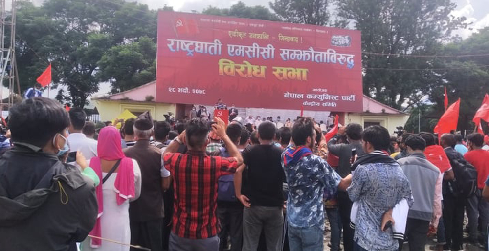 नेपाल कम्युनिष्ट पार्टी (विप्लव) ले देशैभर एमसीसी विरुद्ध सोमवार विरोध जनाएको छ । राष्ट्रघाती एमसीसी नेपाली जनताहरुको हितमा नरहेको भन्दै कडा विरोध जनाएको हो । विप्लवले यस अघिनै पनि एमसीसी स्वीकार्य नहुने प्रतिक्रिया दिँदै आएको थियो । एमसीसी उपाध्यक्ष फातिमा सुमार एमसीसी सम्झौताका लागि ४ दिन नेपाल भ्रमणमा आएपछि यसको विरोधमा जताततै बिभिन्न व्यक्ति पार्टी संस्थाहरुले खबरदारी गर्दै आईरहेको छ ।