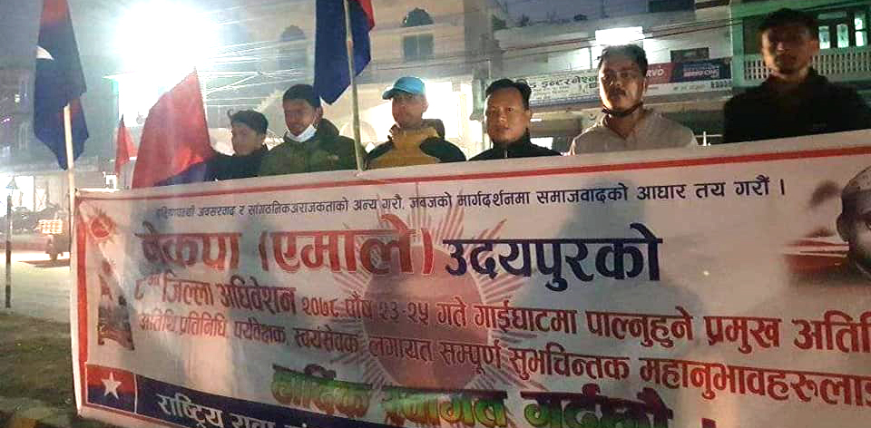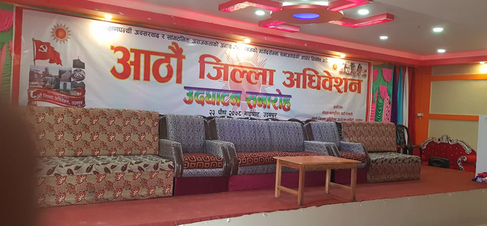 नेकपा एमाले उदयपुरको आठौँ जिल्ला अधिवेशन आज गाईघाटको टाउन हलमा हुँदैछ । पार्टीले आज उदयपुर सहित करिब ६१ जिल्लाहरुमा एकैसाथ जिल्ला अधिवेशन गर्ने तयारी भईरहेको जनाएको छ । ६१ बाहेक बाँकि जिल्लाहरुमा भने पछि मात्र अधिवेशनका लागि तयार गर्ने पार्टीले जनाएको छ । उदयपुरमा अधिवेशनका लागि केहिदिन अघि बाटै भव्य तयारी भईरहेको छ ।