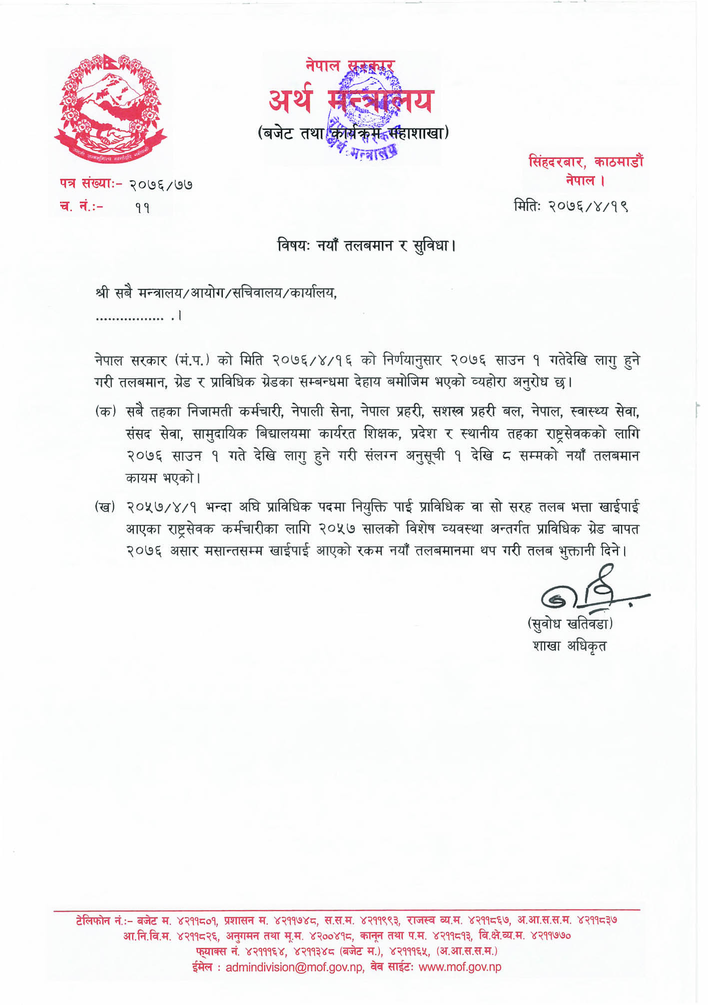 सरकारले कर्मचारीको तलब बृद्धि भएको सुचि सर्वाजनिक गरेको छ । कर्मचारीको तलब बृद्धि गर्ने घोषणा गरेको भएपनि तत्काल सार्वजनिक गरेको थिएन ।