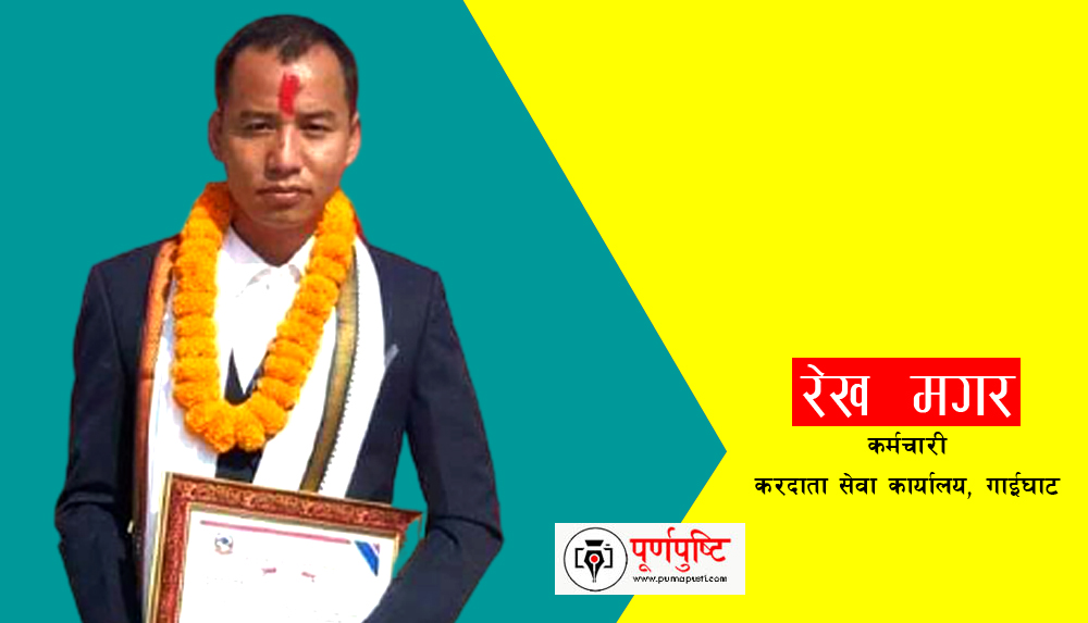 दशौं राष्ट्रिय कर दिवस २०७८ को अवसरमा उदयपुर जिल्ला स्थित करदाता सेवा कार्यालय गाईघाटका कर्मचारी रेख मगर पुरस्कृत भएका छन् । उत्कृष्ट कार्यसम्पादन गरेकोमा उनी पुरस्कृत भएका हुन् ।
