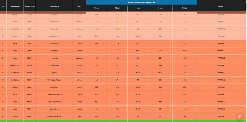 पूर्णपुष्टि, असोज ११ । अत्यधिक वर्षाका कारण नेपालका १४ वर्षा मापन केन्द्रमा चेतावनीको तह पार भएको छ । जल तथा मौसम विज्ञान विभागका अनुसार, यी केन्द्रहरू मुख्यतया कोशी प्रदेशमा अवस्थित छन् । मोरङ, झापा, उदयपुर र इलाम जिल्लाका साथै मधेश प्रदेशको सप्तरी र लुम्बिनीको पाल्पामा पनि अत्यधिक वर्षा भएको छ ।