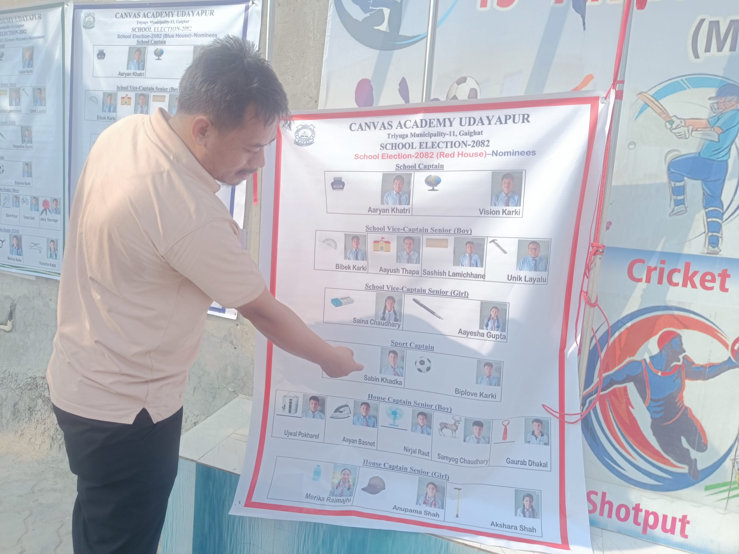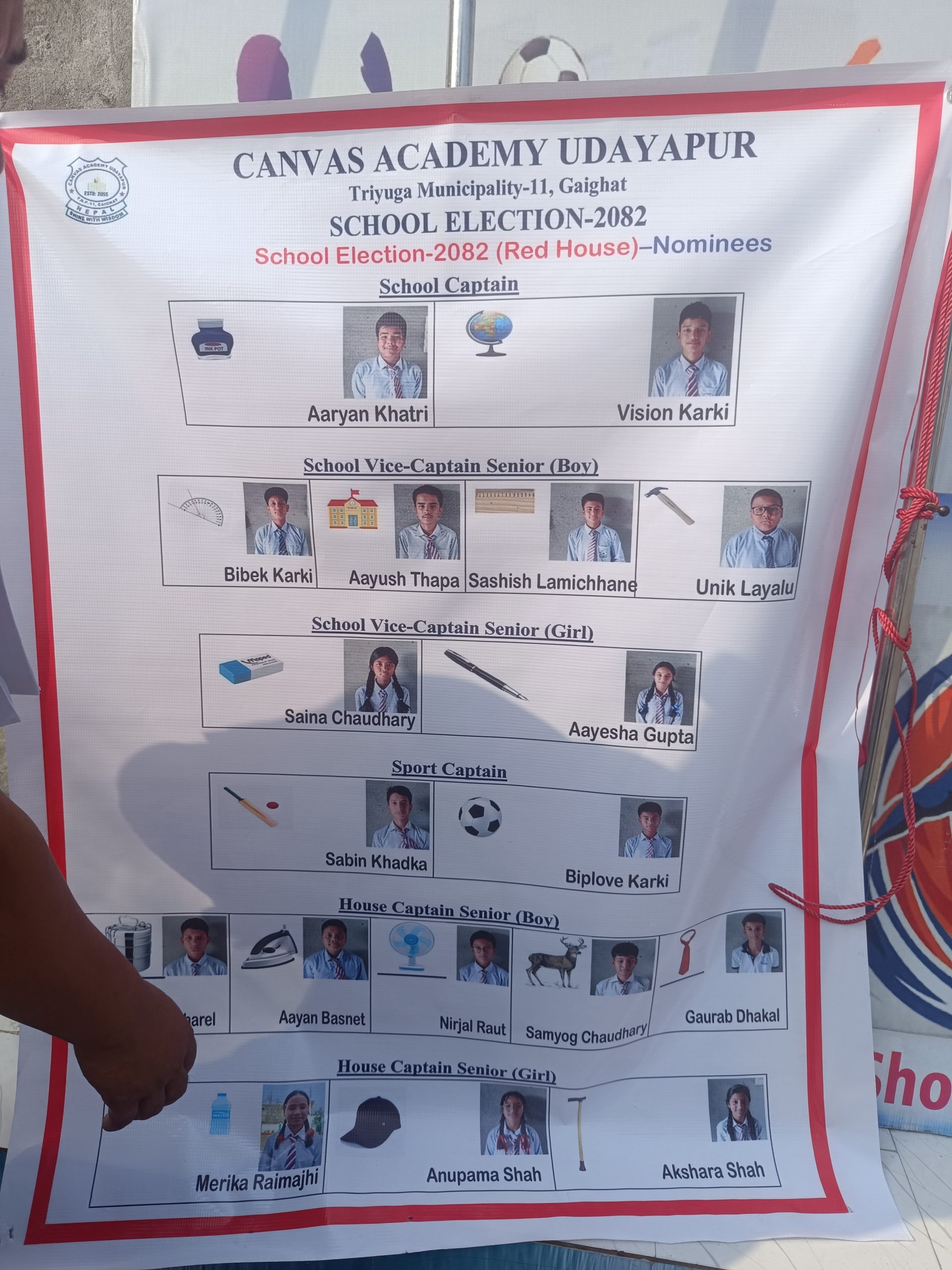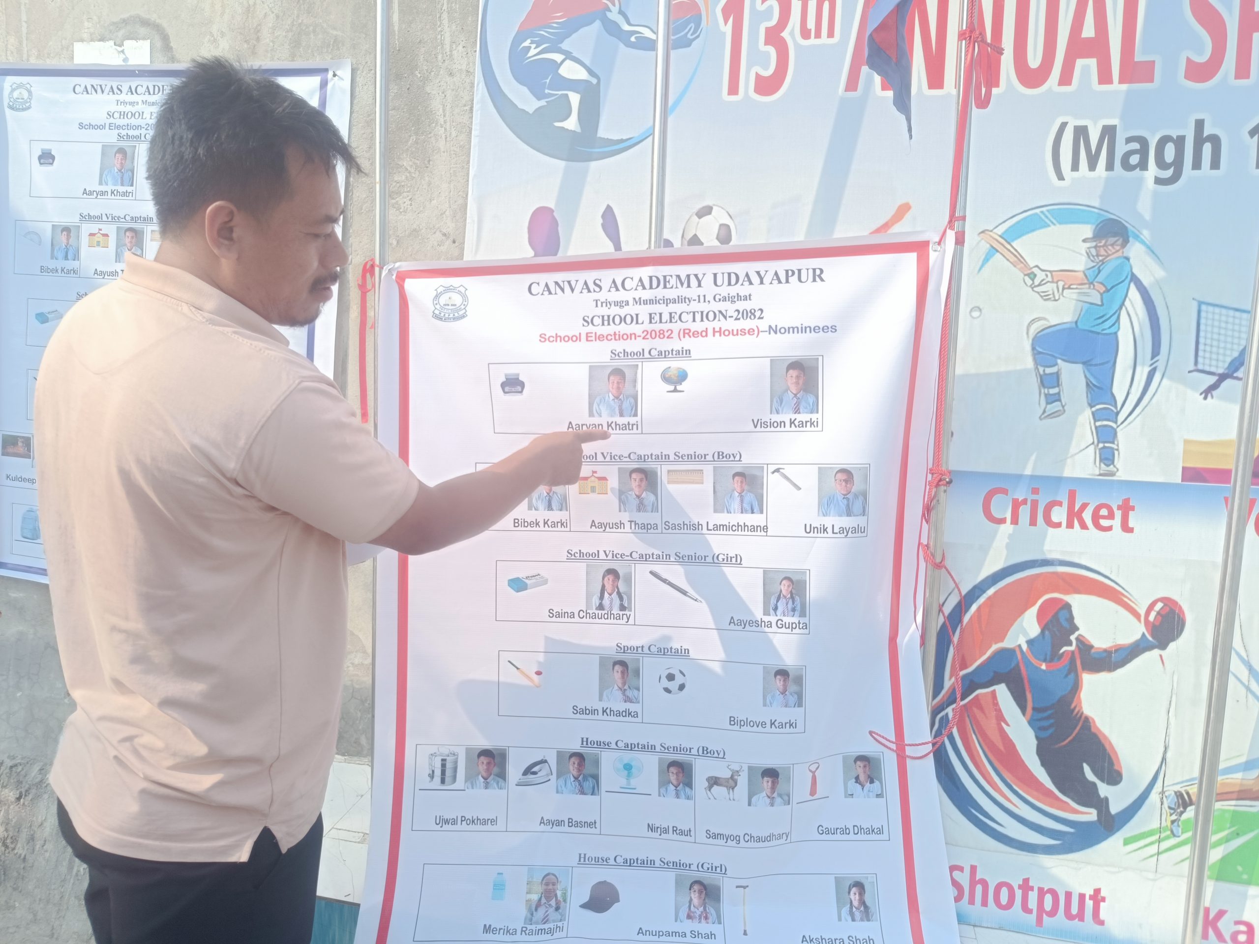 गाईघाट स्थित क्यानभास एकेडेमी बोर्डिङले विद्यार्थीको नेतृत्व चयन गर्न निर्वाचन गराएको छ । शुक्रबार विद्यालय परिसरमै नेतृत्व चयनका लागि निर्वाचन गरिएको हो । निर्वाचन अधिकृत भैरव श्रेष्ठका अनुसार विद्यालय क्यापटेन लगायत बिभिन्न पदहरुमा निर्वाचन गराईएको छ । विद्यालय क्याप्टेन, व्वाईज र गल्र्स तर्फ सिनियर भाईस क्याप्टेन, स्पोर्ट क्याप्टेन र बिभिन्न चार हासउ अन्तर्गत सिनियर व्वाईज र गल्र्स क्याप्टेनहरुका लागि चुनाव गराईएको अधिकृत श्रेष्ठको भनाई छ । निर्वाचन आयोग कार्यालयको समन्वयमा सामाग्रीहरु जुटाएर विद्यार्थीहरुलाई चुनाव गराईएको हो । रेड, ग्रिन, यल्लो र ब्लु गरी चार ओटा हाउसहरु बिभाजित गरीएको छ । सोही अनुसार आ–आफ्नो हाउस छुटाएर चुनाव गराईएको विद्यालयले जनाएको छ । कक्षा ५ देखी ७ सम्म जुयिर २९८ जना र ७ देखी १० सम्मको सिनियर २७७ जना गरी जम्मा ५७५ जना विद्यार्थी मतदादाहरु रहेका छन् ।
