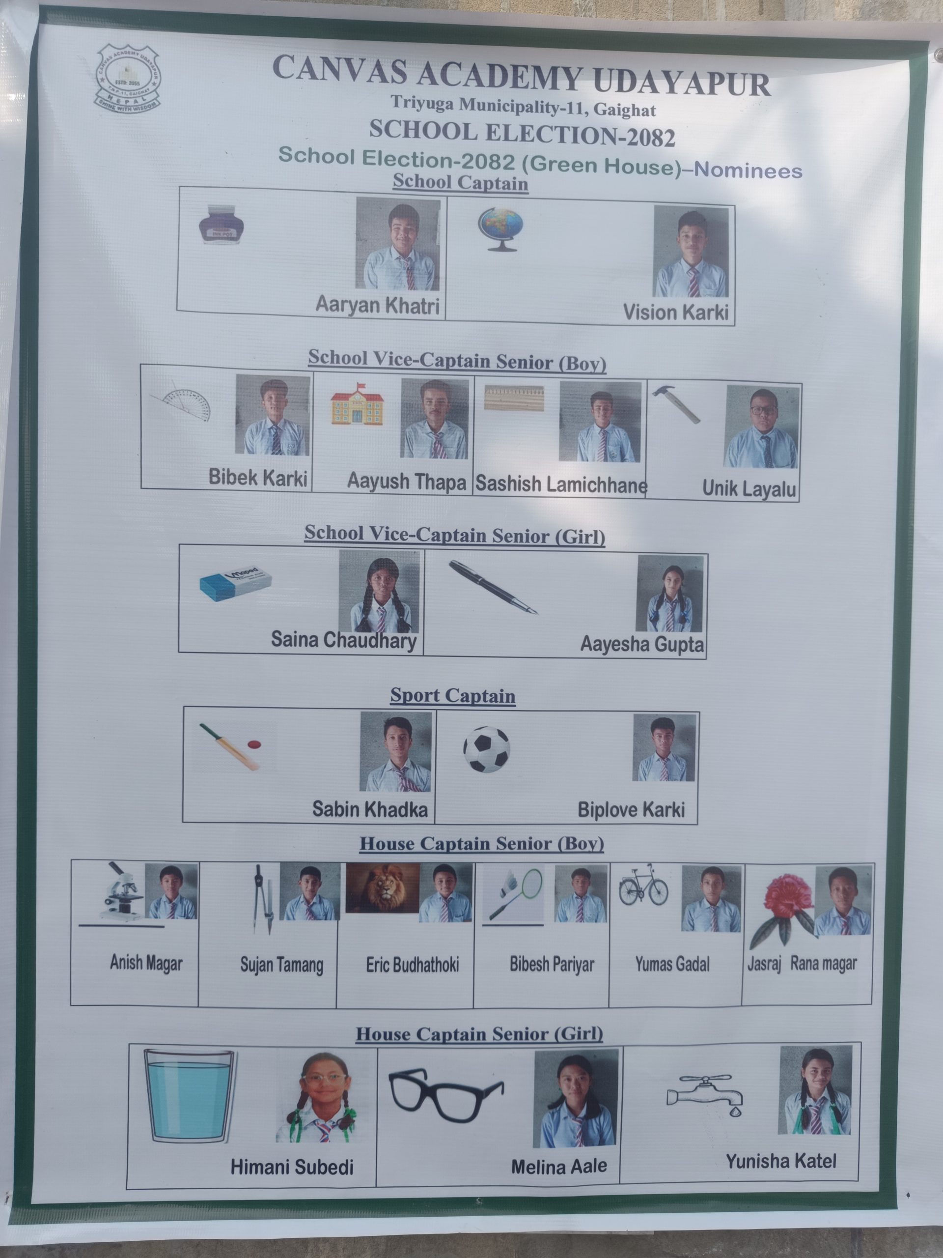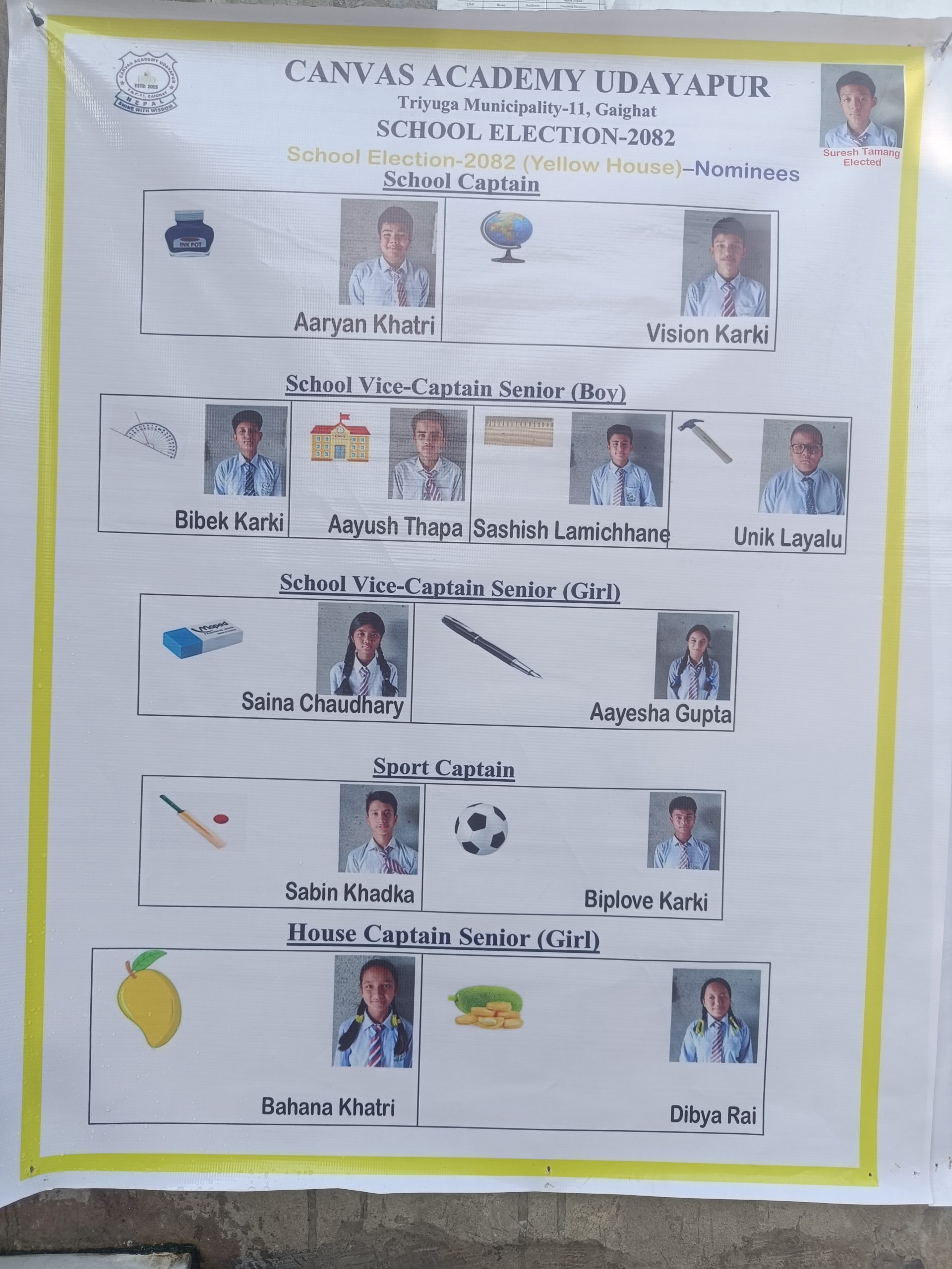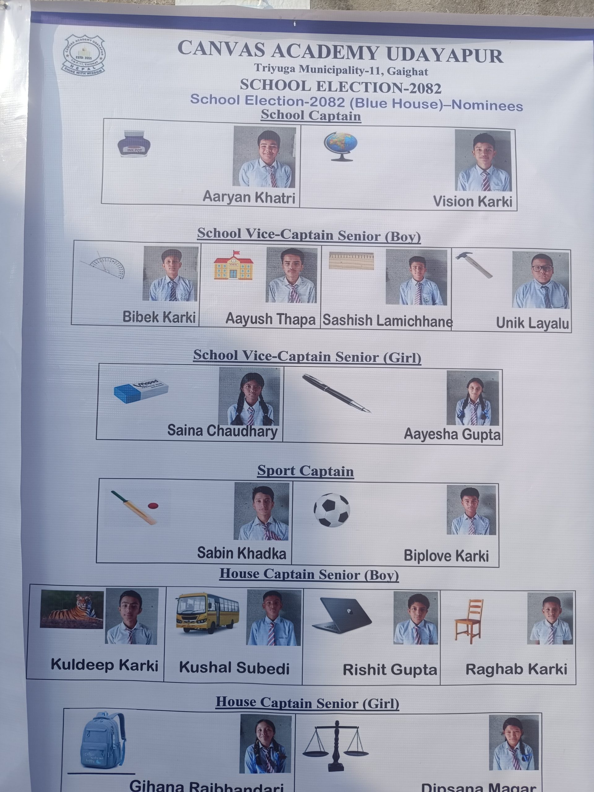 गाईघाट स्थित क्यानभास एकेडेमी बोर्डिङले विद्यार्थीको नेतृत्व चयन गर्न निर्वाचन गराएको छ । शुक्रबार विद्यालय परिसरमै नेतृत्व चयनका लागि निर्वाचन गरिएको हो । निर्वाचन अधिकृत भैरव श्रेष्ठका अनुसार विद्यालय क्यापटेन लगायत बिभिन्न पदहरुमा निर्वाचन गराईएको छ । विद्यालय क्याप्टेन, व्वाईज र गल्र्स तर्फ सिनियर भाईस क्याप्टेन, स्पोर्ट क्याप्टेन र बिभिन्न चार हासउ अन्तर्गत सिनियर व्वाईज र गल्र्स क्याप्टेनहरुका लागि चुनाव गराईएको अधिकृत श्रेष्ठको भनाई छ । निर्वाचन आयोग कार्यालयको समन्वयमा सामाग्रीहरु जुटाएर विद्यार्थीहरुलाई चुनाव गराईएको हो । रेड, ग्रिन, यल्लो र ब्लु गरी चार ओटा हाउसहरु बिभाजित गरीएको छ । सोही अनुसार आ–आफ्नो हाउस छुटाएर चुनाव गराईएको विद्यालयले जनाएको छ । कक्षा ५ देखी ७ सम्म जुयिर २९८ जना र ७ देखी १० सम्मको सिनियर २७७ जना गरी जम्मा ५७५ जना विद्यार्थी मतदादाहरु रहेका छन् ।