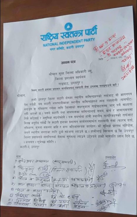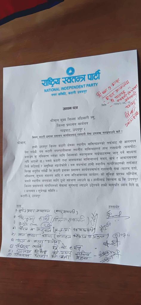 गाईघाट÷पूर्णपुष्टि, असोज २४ । राष्ट्रिय स्वतन्त्र पार्टी (रास्वपा) ले उदयपुर जिल्लाको पश्चिमी भागमा रहेको कटारी नगरपालिकाबाटै राहदानी वितरण तथा नवीकरण सेवा उपलब्ध गराउनुपर्ने माग माग गरेको छ । राष्ट्रिय स्वतन्त्र पार्टी (रास्वपा) नगर कमिटी कटारीले बिहिबार जिल्ला प्रशासन कार्यालय उदयपुरका प्रमुख जिल्ला अधिकारी प्रेम प्रसाद लुइँटेललाई ज्ञापनपत्र बुझाउँदै यो माग गरेको हो ।