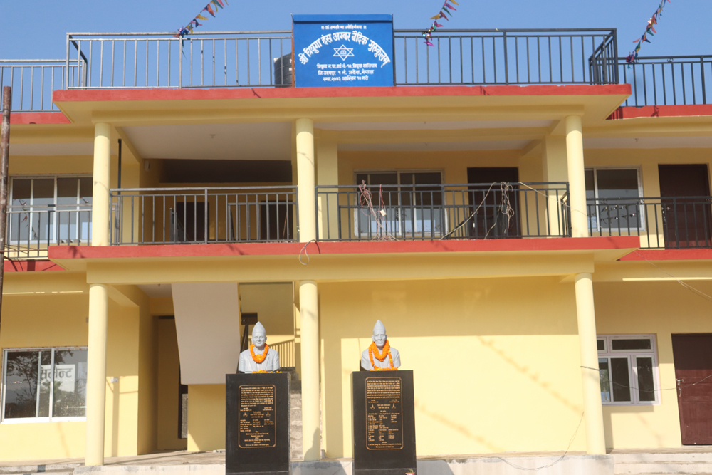 भवनको उद्घाटन तथा हस्तान्तरण नेपाल राष्ट्रका प्रथम जगतगुरु अनन्त श्री बिभुषित श्री बालसन्त मोहन शरण देवाचार्यले गर्नु भएको छ । दाहाल खत्री परिवारका हजुर बुबा स्वर्गिय हंश बहादुर दाहाल खत्री र स्वर्गिय बाबु अम्बर बहादुर दाहाल खत्रीको स्मृतिमा निर्मित विद्यालय भवनको उद्घाटन तथा हस्तान्तरण एक बृहत कार्यक्रम सहित आईतबार समितिलाइ जिम्मा लगाइएको छ ।