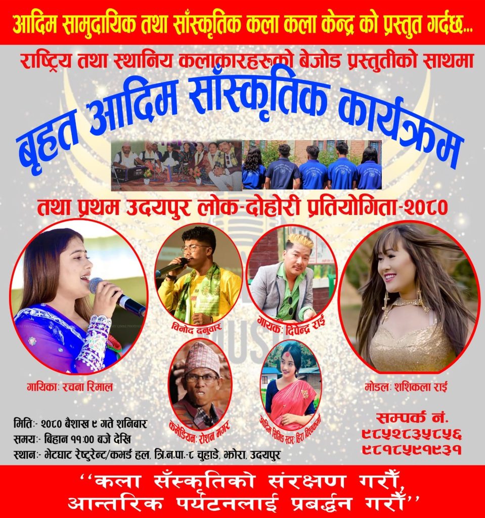 पूर्णपुष्टि,चैत्र २३ । उदयपुरको त्रियुगा नगरपालिका वडा नम्बर-८, चुहाडे स्थित झोरामा बृहत आदिम सांस्कृतक कार्यक्रम तथा प्रथम उदयपुर लोक–दाहोरी प्रतियोगित हुने भएको छ । चुहाडेमा अवस्थ्ति भेटघाट रेष्टुरेन्टको कभर्ड हलमा आयोजना गर्न लागिएको प्रतियोगिता २०८० बैशाख ५ गते शनिवार बिहान ११ बजे देखि सुरु हुने जनाएको छ ।