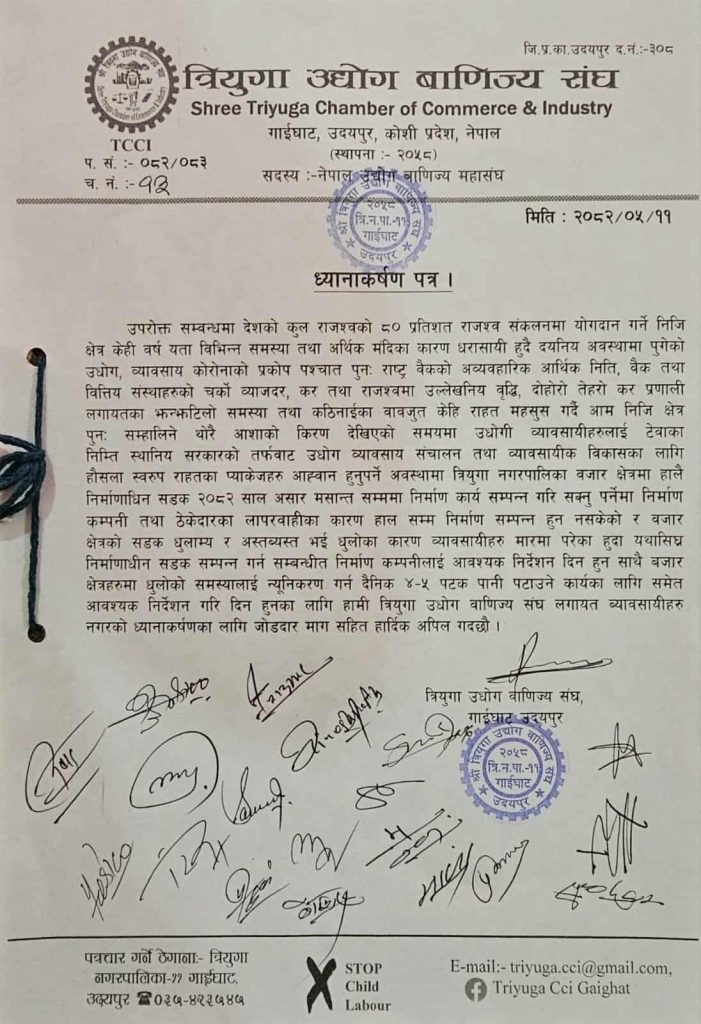 पूर्णपुष्टि, भदौ ११ । त्रियुगा उद्योग वाणिज्य संघले विश्व बैंकको लगानीमा त्रियुगा नगरपालिकाको बजार क्षेत्रमा निर्माणाधीन सडकको धुलो न्युनिकरण गर्न दैनिक ५ पटक सम्म पानी छर्कन माग गरेको छ । बुधबार संघले ध्यानाकर्षण पत्र जारी गर्दै निर्माण कम्पनी र ठेकेदारको लापरवाहीका कारण सडक निर्माण समयमै सम्पन्न नहुँदा धुलोको कारण व्यवसायीहरू समस्यामा परेको जनाएको छ ।