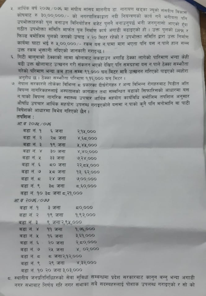 उहाँले नगरपालिकाले सञ्चालन गरेका हरेक क्रियाकलापहरु सम्बन्धति वडाको सिफारिसमा गर्ने गरेको र प्रचलित ऐन नियमको आधारमा संघीय लोकतान्त्रिक गणतन्त्रात्मक व्यवस्थाको सुदृढीकरणको हिसावले गर्ने गरेको बताउनुभयो ।