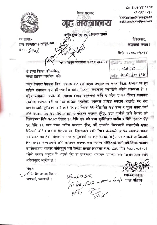 राष्ट्रिय जनगरणना २०७८ विना अवरोध सुचारु गर्न गृह मन्त्रालयले एक सुचना जारी गरेको छ । मन्त्रालयले कोरोना भाईरस कोभिड–१९ बाट बच्न सुरक्षा मापदण्ड पालना गरी जनगणना कार्य सञ्चालन गर्न आग्रह गरेको हो ।