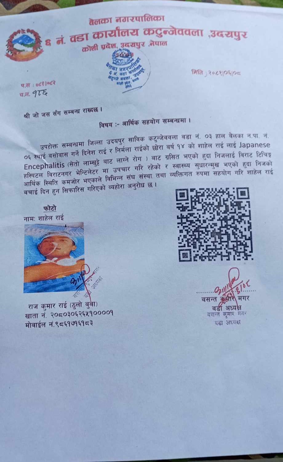 बेलका नगरपालिका ६ घर भएका १४ बर्षिय सायल राई ४७ दिन देखी जापानिज (इन्सेप्लाईटिस) रोग सँग लडिरहेको छ । बेलका नगरपालिकाको जडाहा स्थित बेलका बोर्डिङ कक्षा ६ मा अध्यानरत सायल यतिवेला रोग सँगको कष्टकर जुधाईमा छ । सायलको उपचारको लागि परिवारले १६ लाख बढी खर्चिसकेको छ । ४७ दिन देखी बिराट टिचिङ हस्पिटलको भेण्डीलेटरमा राखेर उपचार गराईरहेको सायललाई थप उपचार अघि बढाउन आर्थिक समस्या परेको भन्दै परिवारले उपचारमा सघाउन सबैसामु सहयोगको अपिल गरेको छ ।