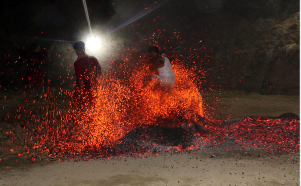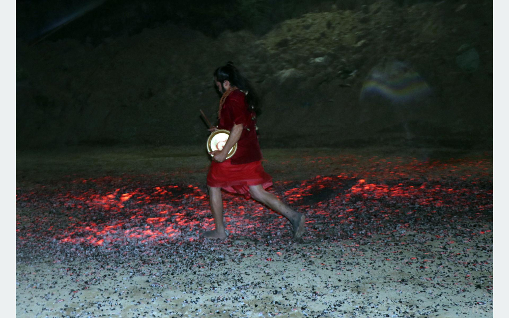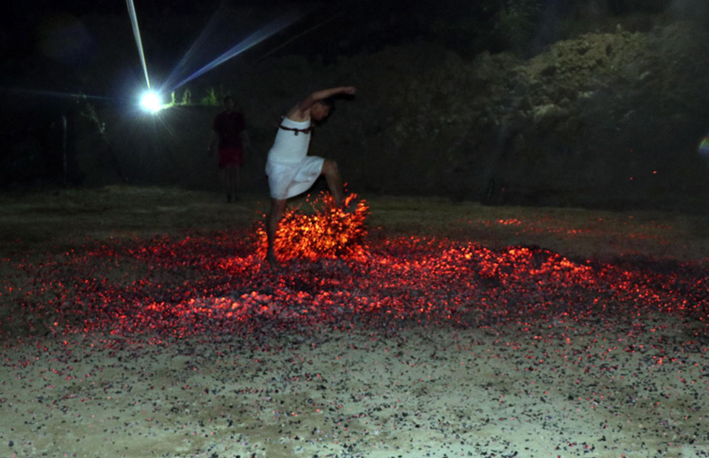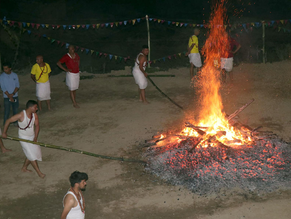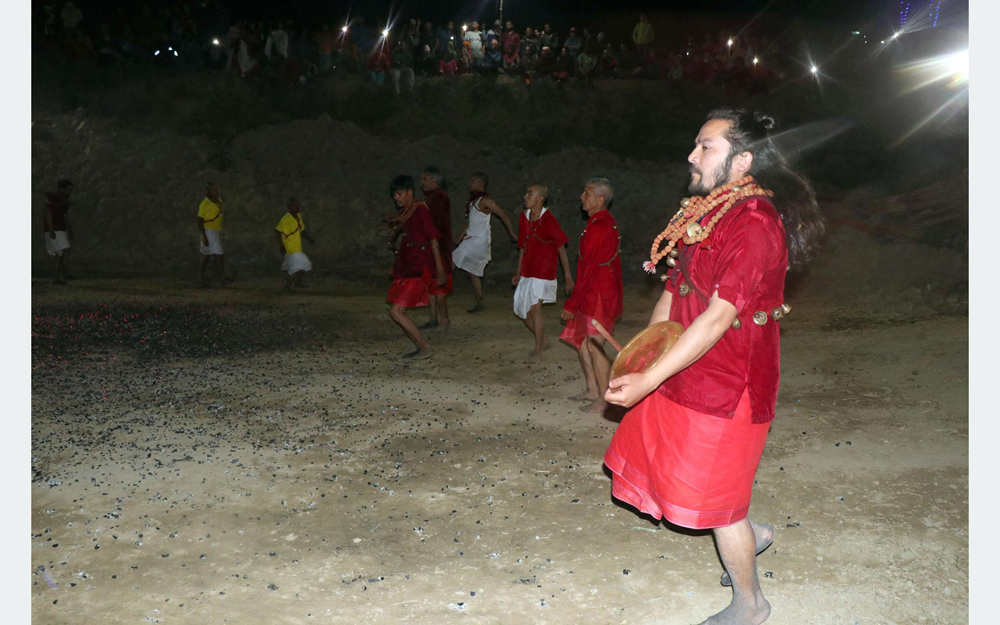 दुई घन्टाभन्दा बढी समय बलेकोे दाउरा सबै आगाका भुङ्ग्रामा परिणत भयो । त्यसपछि सेतो, पहेँलो, रातो वस्त्रधारी पुरुषहरूले तान्त्रिक विधिबाट आगाका भुङ्ग्रामा गाईको घिउ मोलिएको जौ र तीलको चरु हालेर पूजा गरी मूल घरतर्फ लागे । मध्यराति करिब ११ बजे गिरीबस्तीसँगै वरिपरिबाट भेला भएका मानिस बारीको डिलमा बसेर निकै कौतुहलताका साथ ‘अग्निकुण्ड’ तर्फ हेर्दै अब के हुन्छ, आगोमाथि मान्छे कसरी नाच्छन् भनी हेर्दै थिए ।