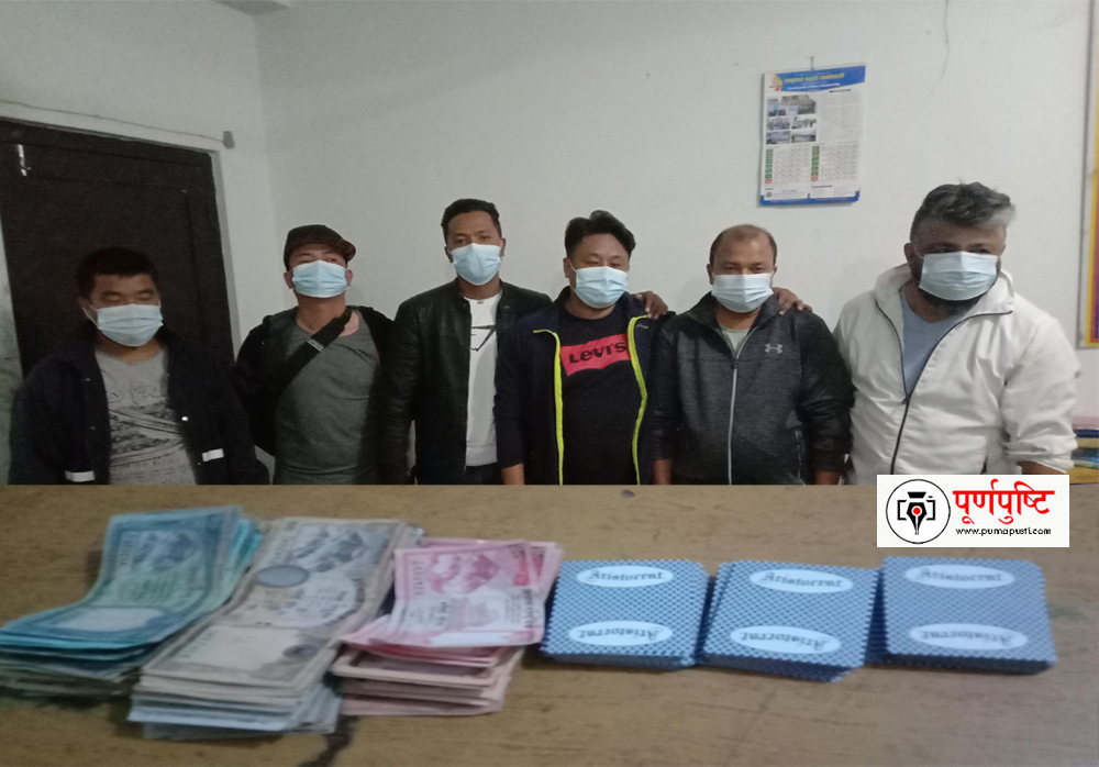 पूर्णपुष्टि, मंसिर ६  झापाको दमक नगरपालिका २ का मोहन कुमार तामाङको घरबाट तास खेलिरहेको अबस्थामा तामाङ सहित ६ जनालाई पक्राउ गरिएको छ । पक्राउ पर्नेमा घर धनि मोहन कुमार तामाङ, सोही स्थानका ३८ बर्षीय पुर्ण प्रसाद शिवाकोटी, ३० बर्षीय बिनोद श्रेष्ठ, ३७ बर्षीय दिल बहादुर श्रेष्ठ, सोही स्थान ३ का ३४ बर्षीय सुरेन्द्र नेम्वाङ र कमल गाऊपालिका ६ का ४१ वर्षीय दुर्गा बहादुर राई रहेका छन् ।