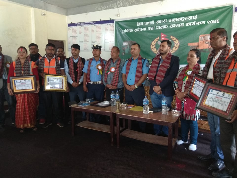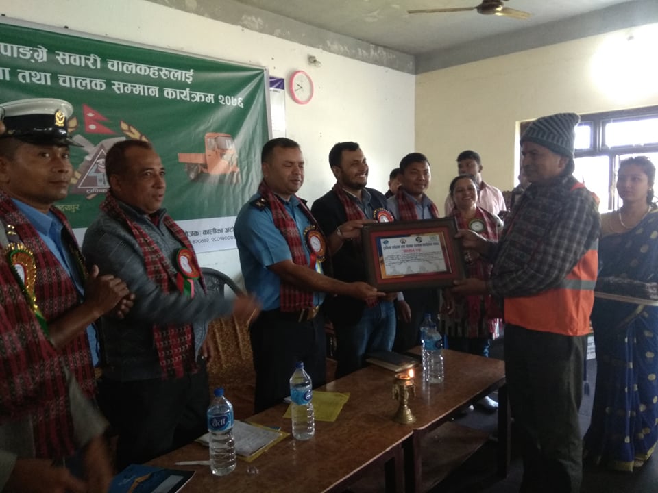 हंशराज हुलासचन्द एण्ड कम्पनी प्राईभेट लिमिटेडको सहयोग तथा कालीका अटो लिंक गाईघाटको आयोजनामा भएको कार्यक्रममा प्रमुख अतिथि जिल्ला प्रहरी कार्यालय उदयपुरका प्रहरी नायव उपरिक्षक हरिकृष्ण केसी, कालिका अटोे लिंकका प्रोपाईटर सुनिल कुमार ठाकुर र कम्पनी प्रतिनिधि विरेन्द्र चौधरीले चालकहरुलाई सम्मान गरेका थिए । सम्मानित चालकहरुलाई खादा ओढाई सम्मान पत्र प्रदान गरिएको थियो ।