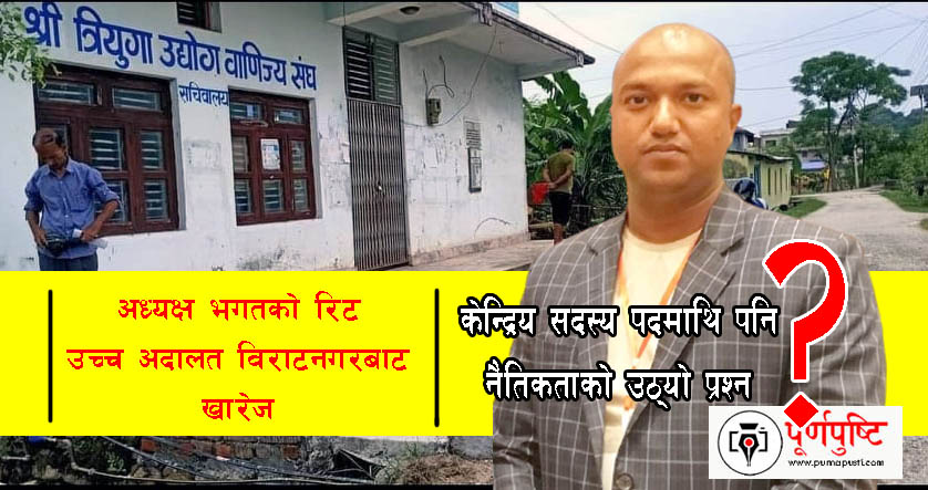 आर्थिक अपचलन ठहर गर्दै साधारण सदस्यसमेत नरहने गरी बहुमत कार्यसमितिबाट कारवाहीमा परेका त्रियुगा उद्योग वाणिज्य संघ, गाईघाटका अध्यक्ष गजेन्द्र भगतले उच्च अदालत विराटनगरमा लगाएको रिट खारेज भएको छ । गत साउन ४ गते दर्ता भएको उनको रिट अदालतले कार्तिक ८ गते खारेज गरेको हो ।