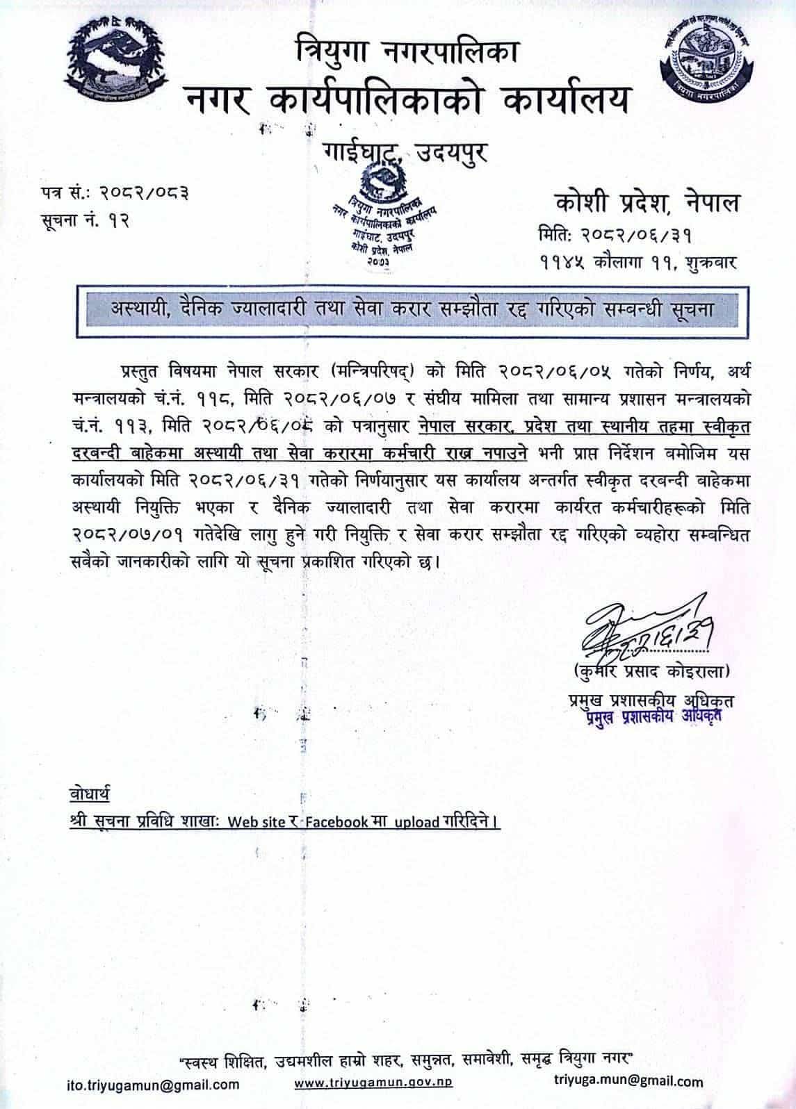 त्रियुगा नगरपालिकाले यहि कार्तिक १ गते देखी लागु हुने गरी अस्थायी, ज्यालादारी र करार सेवाका कर्मचारीहरुको सम्झौता रद्ध गरेको छ । मन्त्रिपरिषदको निर्णयलाई लागु गर्दै त्रियुगाले पनि करार लगायतका कर्मचारीहरु हटाउने निर्णय गरेको हो । उक्त निर्णय नेपाल सरकारले २०८२÷६÷५ गतेको मन्त्रिपरिषदको निर्णय र अर्थ मन्त्रालयको २०८२/६/८ को पत्र अनुसार प्रदेश र स्थानीय तहकै दरवन्दी बाहेकका कर्मचारी हटाउने निर्देशन दिईएकको थियो । सोही पत्रलाई आधार मान्दै त्यस्ता कर्मचारीहरु हटाउन २०८२÷६÷३१ गते नगरले निर्णय गर्दै कार्तिक १ देखी लागु हुने गरी कर्मचारी हटाएको हो ।