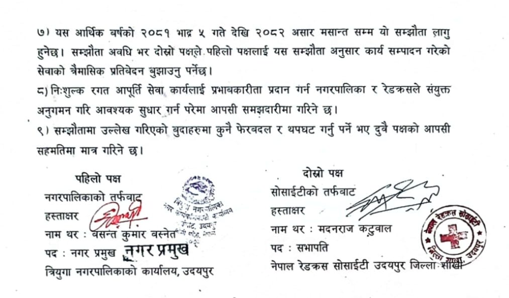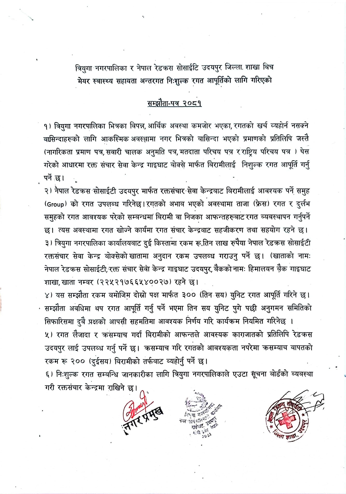 नेपाल रेडक्रस सोसाईटी उदयपुरले त्रियुगा नगरपालिका सँग निशुल्क रगत व्यवस्थाको लागि सम्झौता गरेको छ । बुधबार त्रियुगा नगरपालिकाका मेयर वसन्त बस्नेत र रेडक्रसका सभापति मदनराज कटुवालबीच ९ बुद्धे सम्झौता पत्र सहित रगत व्यवस्थाको लागि काम अघि बढेको हो ।