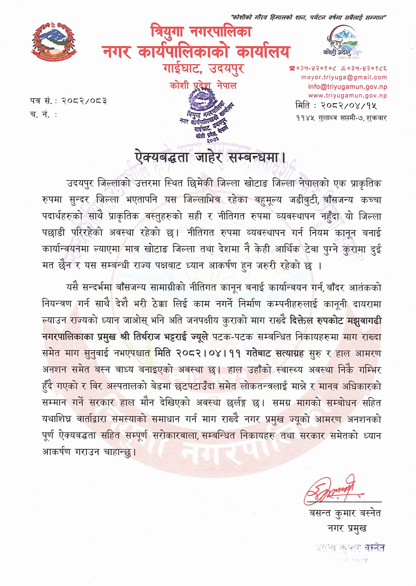 खोटाङको दिक्तेल रुपाकोट मजुवागढी नगरपालिकाको मेयर तिर्थराज भट्टराईको आन्दोलनमा त्रियुगा नगरपालिका गाईघाटका मेयर वसन्त वस्नेतले ऐकबद्धता जनाएको छ । स्थानीय कच्चा पदार्थ सहज रुपमा प्रयोग गर्न पाउनुपर्ने माग गर्दै मेयर भट्टराई काठमाण्डौँको माईतिघर मण्डलामा अमरन अनसन बसिरहेको छ । उनले स्थानीय स्रोत साधनको उचित उपयोग गर्न पाउन माग गर्दै साउन ११ गतेबाट अमरन अनसन सुरु गरेको हो । उनले बाँदर लगायत अन्य बन्यजन्तुले कृषिमा गरेको आतंक, विश्वव्यापी जलबायुको असर, पर्यावरणीय संकट तथा वाँस, गाँजा लगायतका बनस्पती लगायत ७ बुद्धे माग सहितको अनसन सुरु गरेको हो । उक्त माग र अनसनलाई समर्थन गर्दै मेयर वस्नेतले पनि ऐकबद्धता जनाएको हो । वस्नेतले प्रेस बिज्ञाप्तीनै जारी गरेको भट्टराईको उक्त कार्यलाई समर्थत जनाएको हो ।