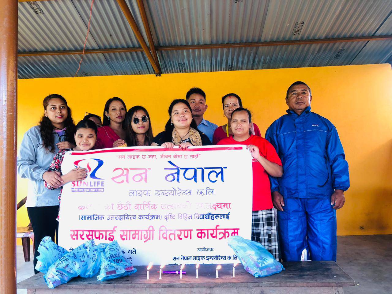 सन नेपाल लाईफ इन्स्योरेन्स कम्पनी गाईघाट शाखाले दृष्टि विहिन विद्यार्थीहरुलाई स्वास्थ्य सामाग्री वितरण गरेको छ । त्रियुगा नगरपालिका वडा नं ७ चुहाडेका जनज्योति माविका ८ जना दृष्टी विहिन विद्यार्थीहरुलाई उक्त सामगा्री प्रदान गरिएको कम्पनीका गाईघाट शाखा प्रमुख बाल कुमार राईले जनाए ।