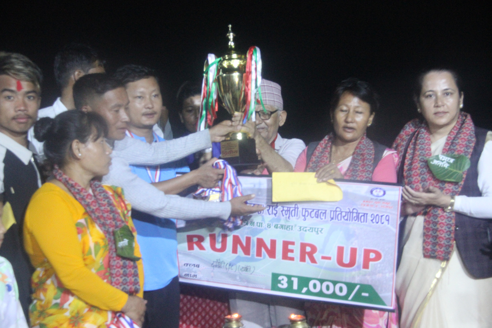 विजेता सगरमाथाले नगद रु. ५१ हजार सहित ट्रफी र मेडल प्राप्त गरे भने उपविजेता दमौटीले नगद रु. ३१ हजार सहित ट्रफी र मेडल प्राप्त गरेका छन् । प्रमुख अतिथि कोशी प्रदेश सभाकी उप–सभामुख सिर्जना दनुवारले विजेता टिम र बिषेश अतिथि त्रियुगा नगरपालिकाकी उप–मेयर मशेश्वरी राईले उपविजेतालाई पुरस्कार हस्ताण्तरण गरेका थिए ।स्व. कैलाश राई युवा फुटबल खेलाडीहरुमाझ लोकप्रिय थिए । फुटवलमा रुची राख्ने राईको कामको शिलशिलामा करेन्ट लागी मृत्यु भएको थियो । कार्यक्षेत्रमा करेन्ट लागेर मृत्यु भएपछि उनको सम्झनामा गत वर्षदेखि यो प्रतियोगिता आयोजना गरिँदै आएको छ ।