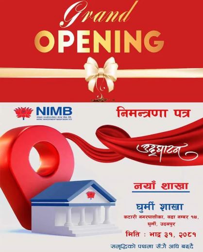 पूर्णपुष्टि, भाद्र ३० । नेपाल इन्भेष्टमेन्ट बैंक लिमिटेडले उदयपुरको घुर्मीमा नयाँ शाखा खोल्ने भएको छ। भदौ १६ गते सोमबारदेखि सञ्चालनमा आउने यो शाखा दुर्गम क्षेत्रका जनतालाई लक्षित गरी खोलिएको हो।