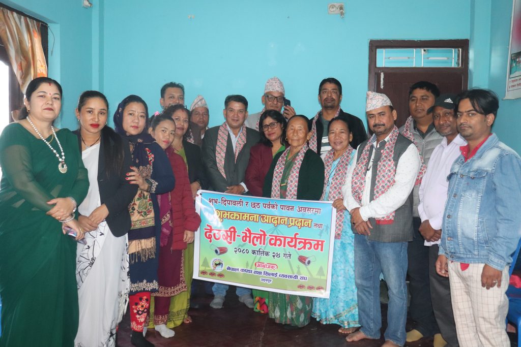 नेपाल कपडा तथा सिलाई व्यवसायी संघले दशैँ तिहार र छैठ लगायत चाडपर्वको शुभकामना आदान प्रदान सँगै देउसी भैलो कार्यक्रमको आयोजना गरेको छ । शुक्रबार गाईघाट स्थित जगत भवनको आफ्नै कार्यालयमा सिलाई व्यवसायी, ब्यपारी लगायत सम्बन्धित क्षेत्रका व्यक्तिहरुको उपस्थितिमा शुभकामना आदान प्रदान तथा देउसी भैलो कार्यक्रम गरेका थिए । संघकी अध्यक्ष ज्ञानु प्रधानले संस्था र सिलाई व्यवसायीहरुको हितमा काम गर्ने भन्दै देउसी भैलो कार्यक्रम समेत गरेको जनाईन् ।