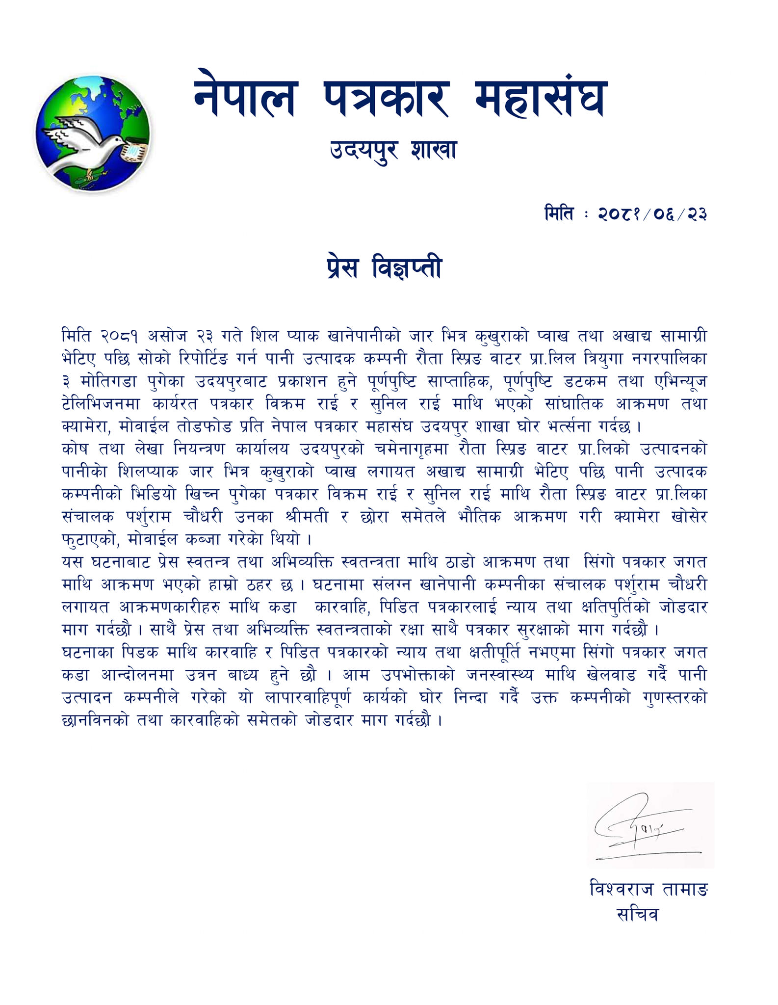 पत्रकार महासंघ उदयपुरले पत्रकार माथी दुव्र्यवहार गर्ने रौता पानी फ्याक्ट्रीका संञ्चालक पर्शुराम चौधरी र संलग्न श्रीमती र छोरामाथी तत्काल कार्वाही गर्न माग गरेको छ । बुधबार साँझ पानी फ्याक्ट्रीले बिक्रि गर्दै आएको शिल्ड प्याक जार भित्र कुखुराको प्वाँख फेला परेपछि त्यस सम्बन्धी समचार संकल गर्न भिडियो खिच्न फ्याक्ट्री पुगेका पूर्णपुष्टि मिडियाको सम्वाददाता बिक्रम राई र सुनिल राईलाई लछार पछार गर्दै क्यामेरा तोडफोड गरेका थिए । सोही घटनालाई उचित अनुसन्धान सहित कार्वाहीको माग गर्दै बिज्ञाप्ती जारी गरेको छ । समचार संकलन गर्न गएका पत्रकारमाथी भएको दुव्र्यवहार प्रति घोर भर्तसना गर्दछौँ । दोषीलाई कडा कार्वाही र तोडफोड भएको सामाग्रीको उचित क्षतीपूर्ति नभएका कडा आन्दोलनमा उत्रिने छौँ, बिज्ञाप्तीमा भनिएको छ ।