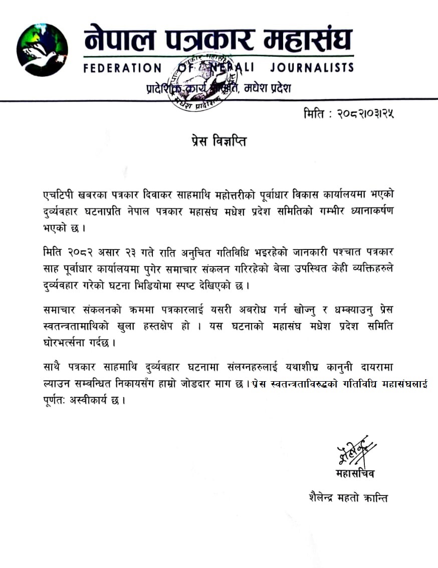 पूर्णपुष्टि, असार २५ । नेपाल पत्रकार महासंघ मधेश प्रदेश कार्य समितिले एचटिपी खबरका पत्रकार दिवाकर शाहमाथि महोत्तरीको पूर्वाधार विकास कार्यालयमा दुव्र्यवहार गर्नेलाई कारवाहिको माग गरेको छ ।