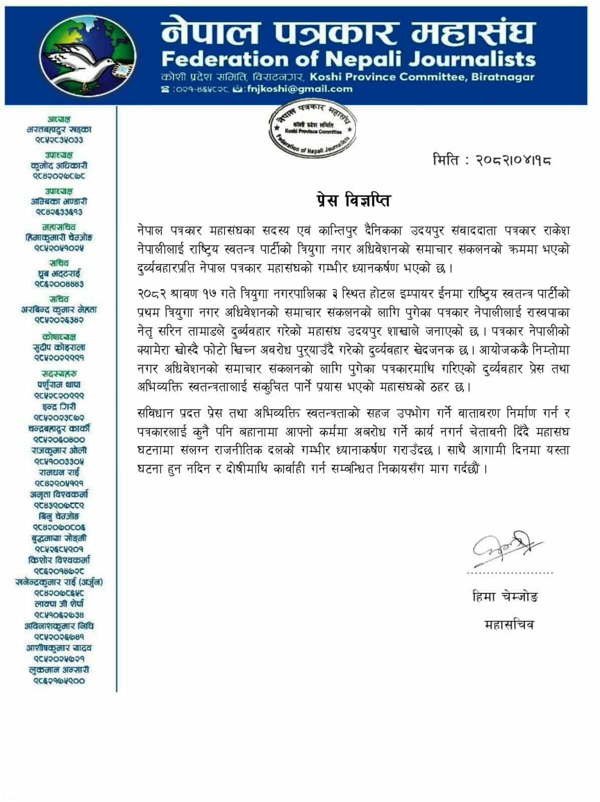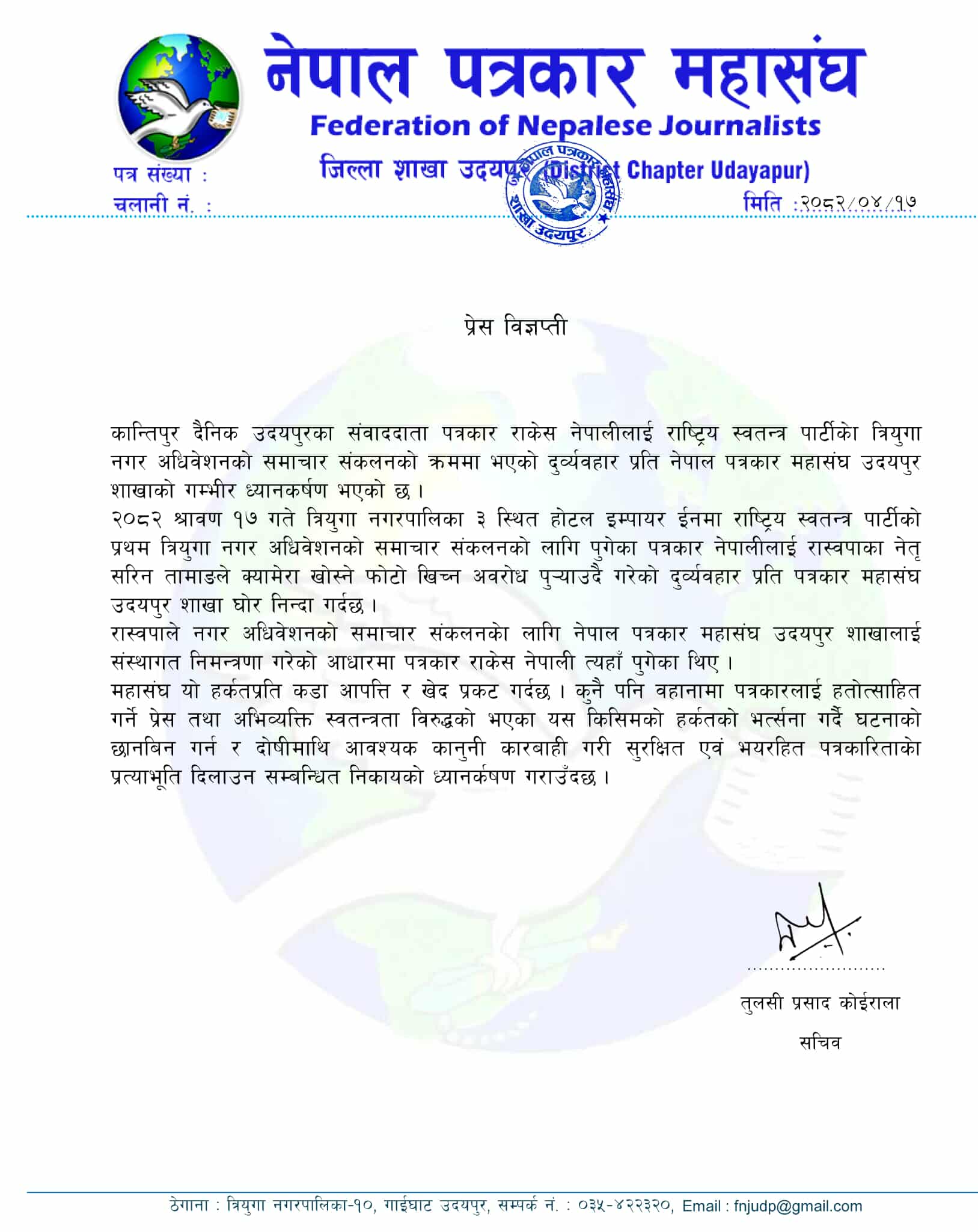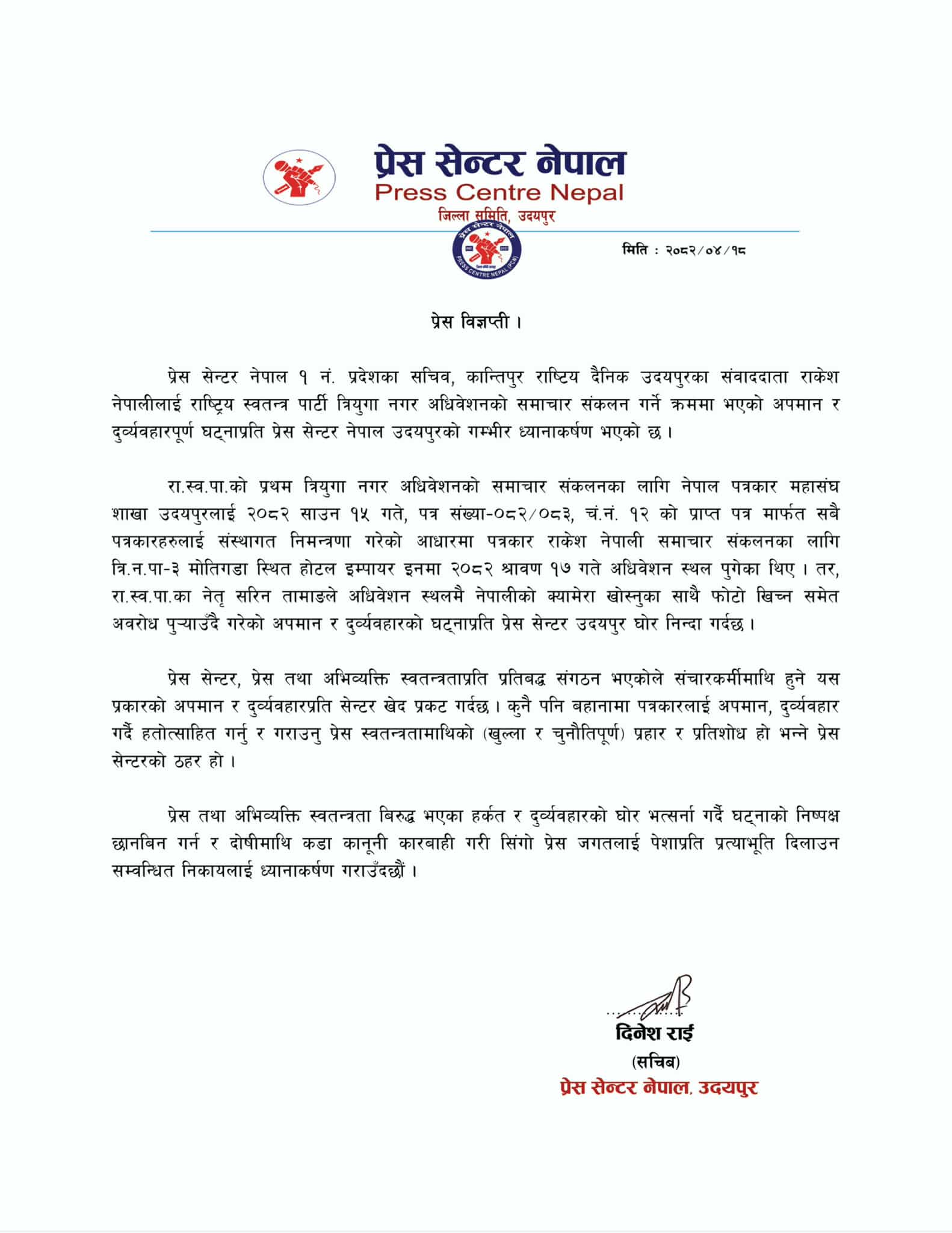 उदयपुरका पत्रकार राकेश नेपापली माथीको दुर्व्यवहारलाई लिएर नेपाल पत्रकार महासंघ उदयपुर र प्रेस सेन्टर उदयपुरले आपत्ति जनाएको छ । रास्वपा त्रियुगा नगर अधिवेशनको समचार संकलन गर्न गएका नेपाली माथी ‘रास्वपाकी नेतृ सरिन तामाङले अधिवेशन स्थलमै क्यामेरा खोस्नुका साथै फोटो खिच्नसमेत अअवरोध गरेको नेपालीको भनाई छ । उक्त घटनाप्रति महासंघ र प्रेस सेन्टर उदयपुरले घोर निन्दा गरेको छ । जारी गरिएको विज्ञप्तिमा भनिएको छ, ‘सञ्चारकर्मीमाथि हुने यसप्रकारको अपमान र दुर्व्यवहारप्रति सेन्टर खेद प्रकट गर्दछ । कुनै पनि बहानामा पत्रकारलाई अपमान, दुर्व्यवहार गर्दै हतोत्साहित गर्नु र गराउनु प्रेस स्वतन्त्रतामाथिको ९खुल्ला र चुनौतीपूर्ण० प्रहार र प्रतिशोध हो भन्ने प्रेस सेन्टरको ठहर हो ।’