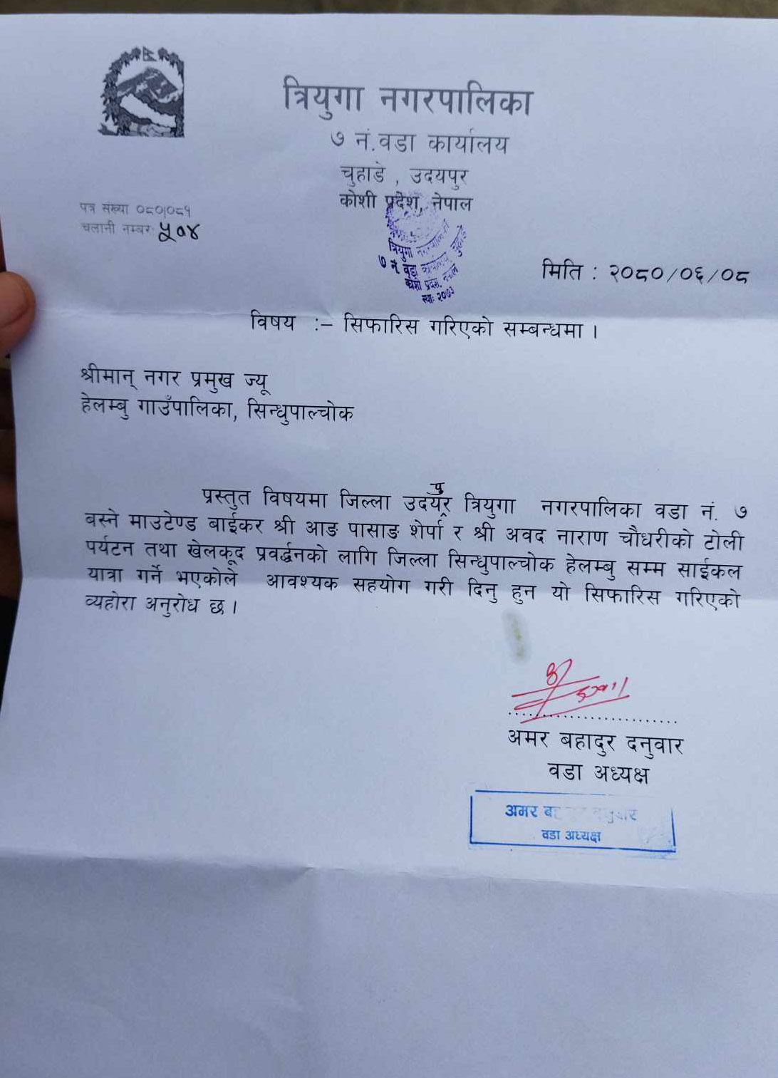 उदयपुरका दुई साईकल यात्री मंगलबार हेलम्वु तर्फ लागेका छन् । देलकुद र पर्यटन प्रवद्र्धनको बिकास गर्ने मुख्य उदेश्यका साथ त्रियुगा नगरपालिका ७ का आङपासाङ शेर्पा र त्रियुगा नगरपालिका ११ का अबैध नारायण चौधरी सिन्धुपाल्चोकको पर्यटकीय स्थल हेलम्वु गाउँपालिका तर्फ लागेका हुन् ।
