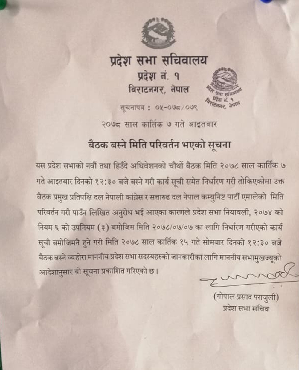 प्रदेशसभा सचिवालयले जारी गरेको सूचनामा प्रमुख प्रतिपक्षी नेपाली कांग्रेस र सत्तारुढ दल नेकपा एमालेले प्रदेशसभा बैठक सार्न माग गरी निवदेन दिएकाले बैठक स्थगित गरिएको उल्लेख छ ।