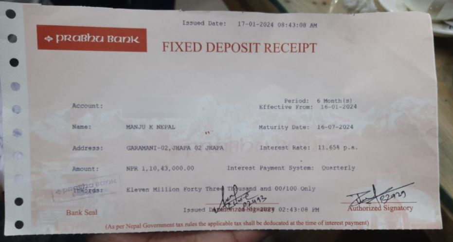 पूर्णपुष्टि, साउन १७ । झापामा प्रभु बैंकको स्थानिय शाखामा एक पत्रकारले राखेको १ करोड १० लाख ४३ हजार रुपैयाँको फिक्स्ड डिपोजिट रहस्यमय तरिकाले गायब भएको छ।