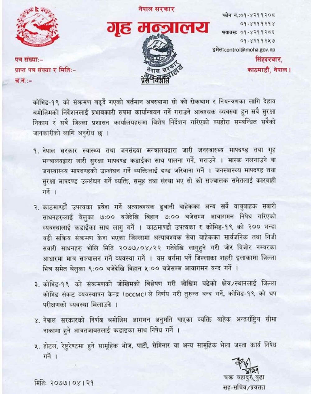 स्वास्थ्य मापदण्ड पालना नगर्ने कम्पनीहरूलाई समेत कारबाही गर्न निर्देशन दिइएको छ । होटेलमा भोज हुन थालेपछि त्यसमा पनि कडाइ गर्न मन्त्रालयले निर्देशन दिएको छ । भारतमा सङ्क्रमण बढेकाले सीमामा पनि अवैध आवातजावत रोक्न मन्त्रालयले निर्देशन दिएको छ ।